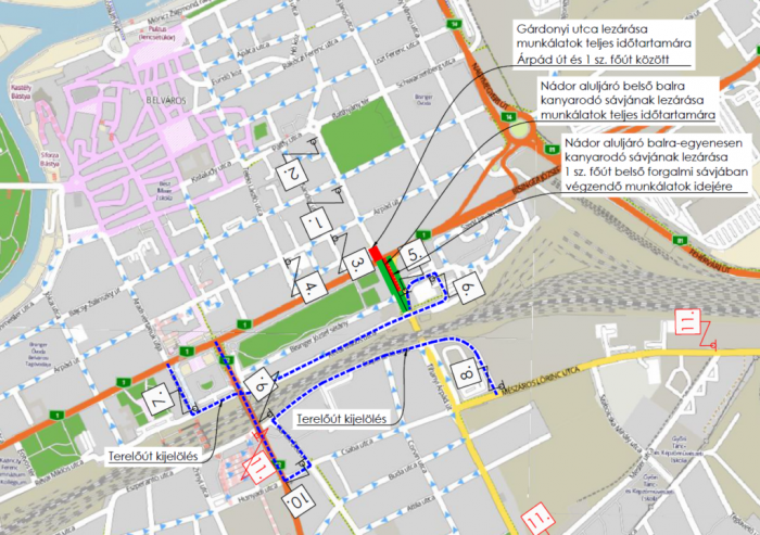 A Nádor aluljáróból ideiglenesen megszűnik a balra kanyarodási lehetőség, illetve a Gárdonyi utca felé sem lehet egyenesen menni. Az aluljárón át közlekedők számára terelőútként az Eszperantó utcát és a Révai utcát jelölik ki a Baross-híd, illetve az Aradi út irányába. A korlátozások a Nádor aluljáróból jobbra, a Szent István útról az aluljáró irányába, valamint a Hegyeshalom – Budapest irányba közlekedőket nem, vagy csak minimálisan érintik.
