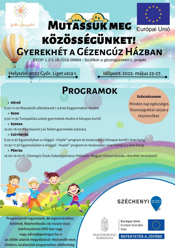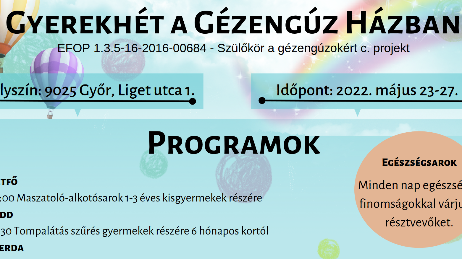 Május 23-27-i héten sok szeretettel várják a családokat a Gézengúz alapítvány ingyenes győri programjaira. Regisztráció szükséges.