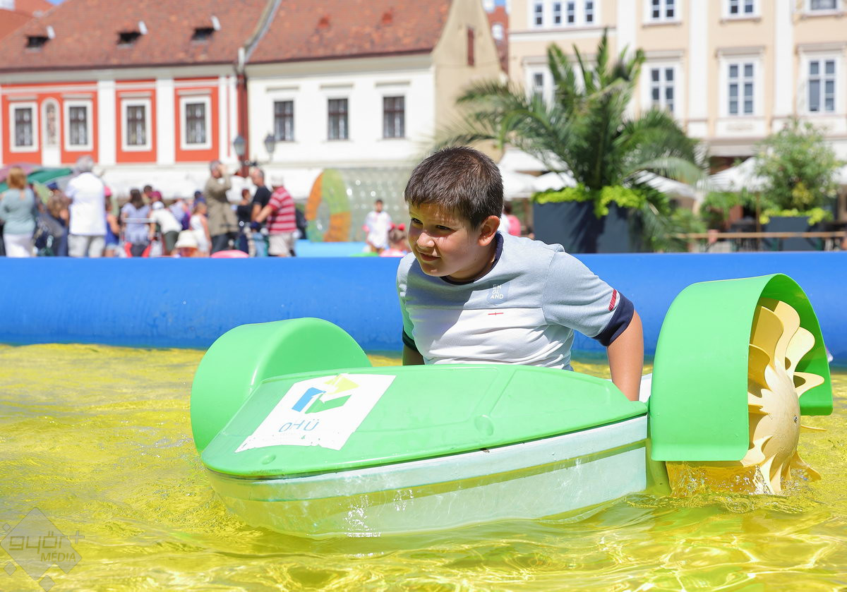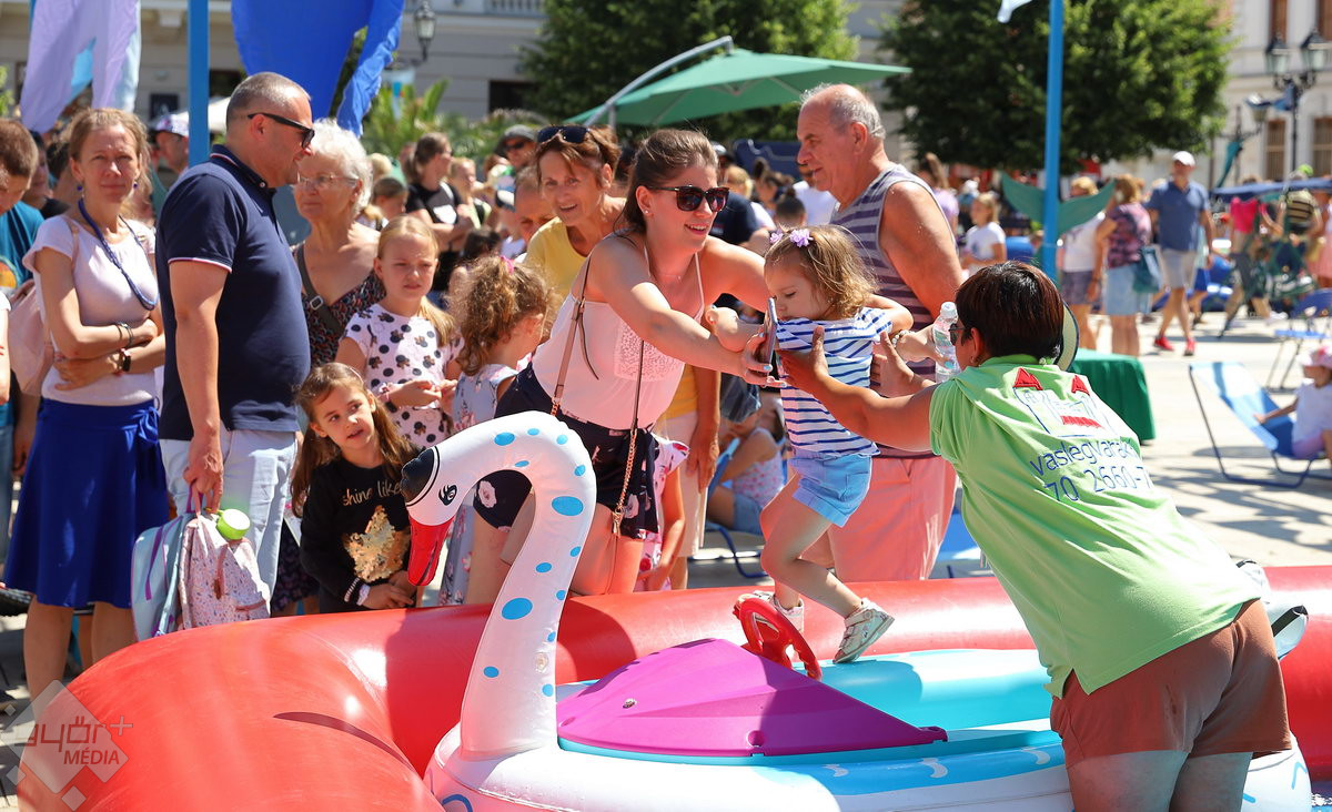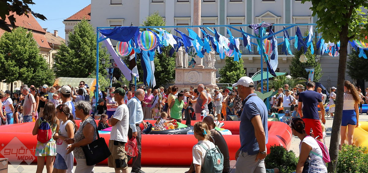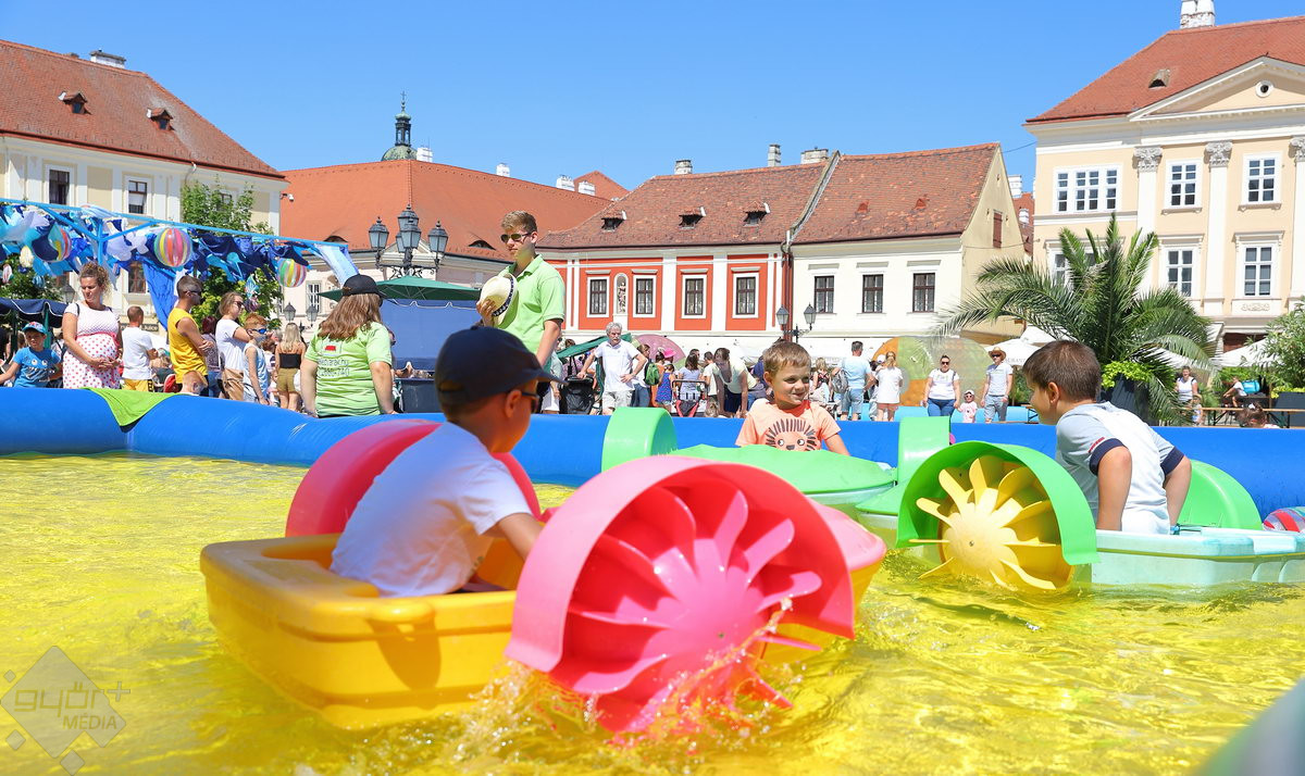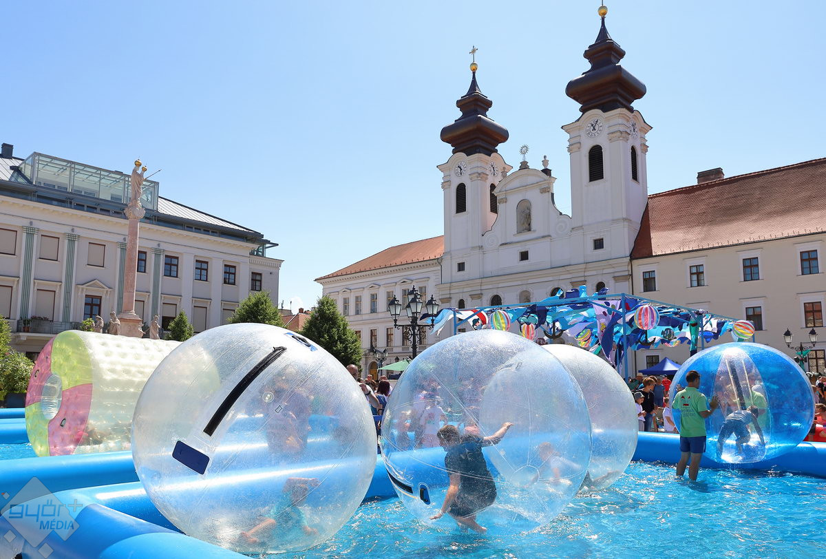A Széchenyi tér igazi stranddá változik a hétvégére: a Hullámzó Győrkőc téren vizes játékokat próbálhatnak ki a gyerekek, de ide települt ki a Pannon-Víz sztárja is, Csövi, az aligátorteknős.
