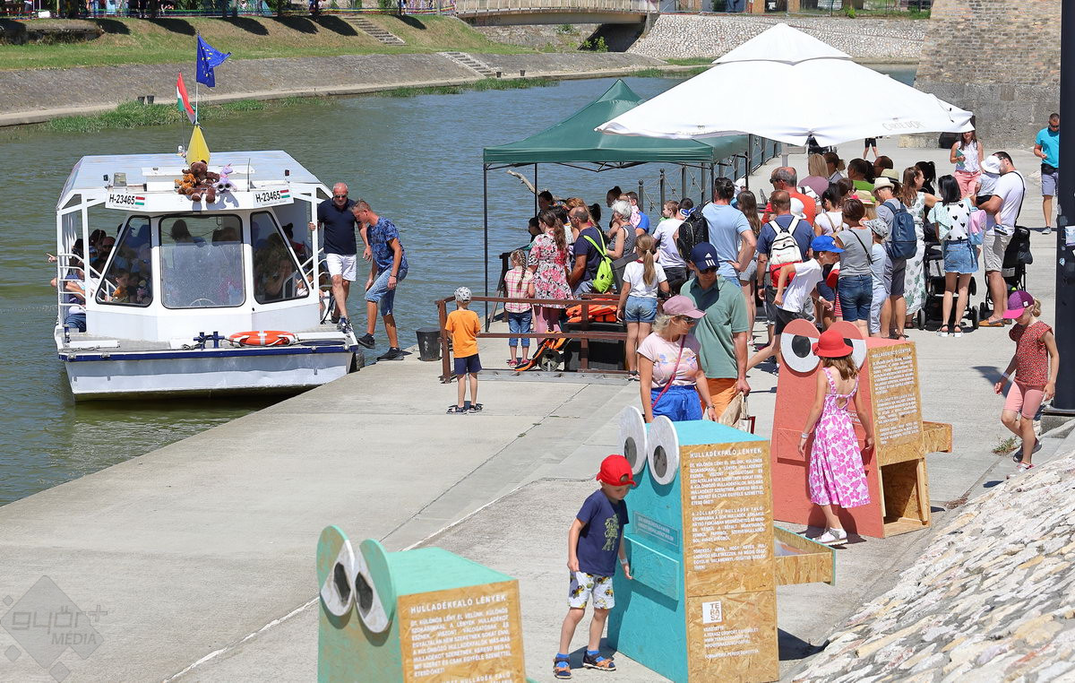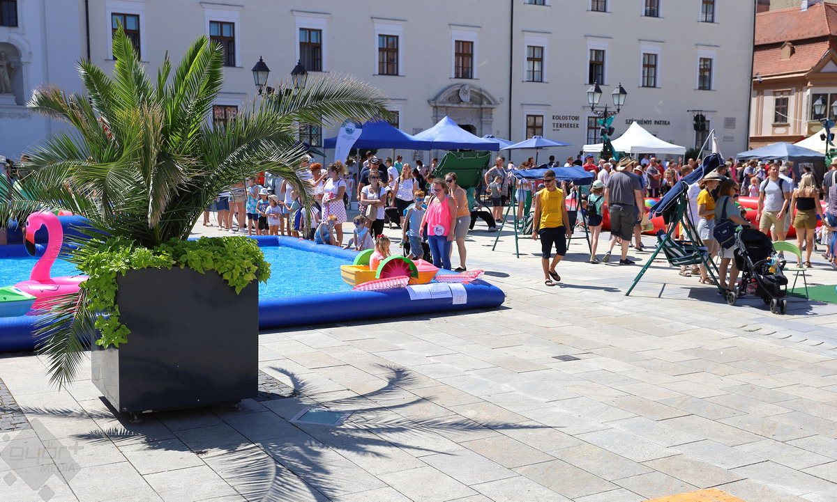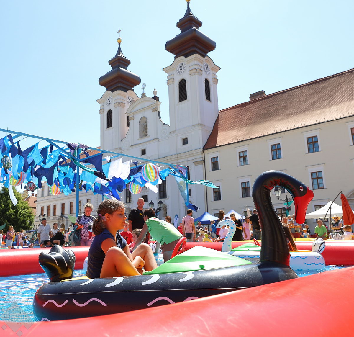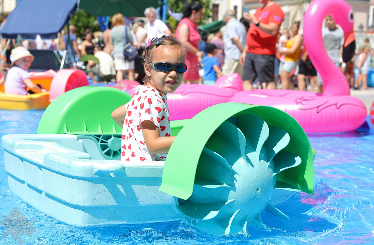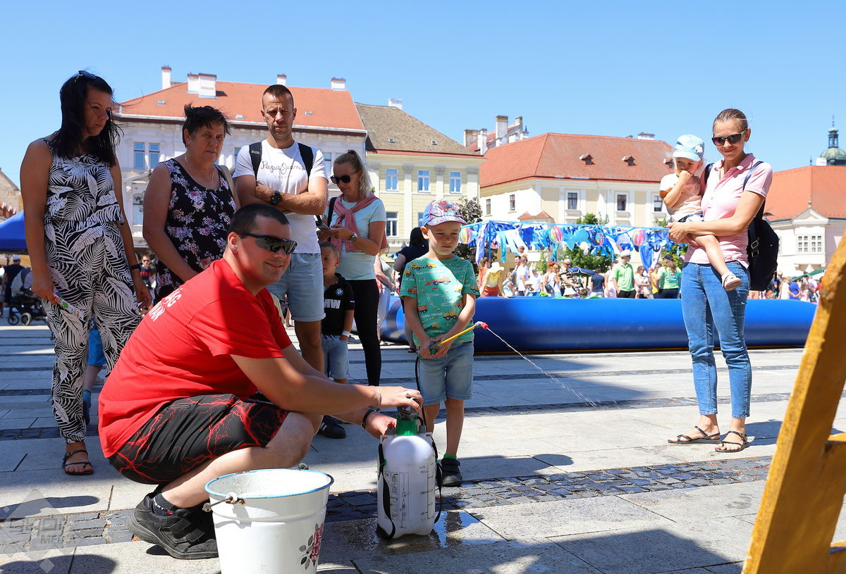 A Széchenyi tér igazi stranddá változik a hétvégére: a Hullámzó Győrkőc téren vizes játékokat próbálhatnak ki a gyerekek, de ide települt ki a Pannon-Víz sztárja is, Csövi, az aligátorteknős.