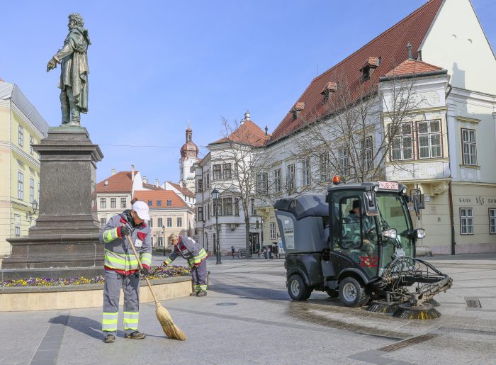 A kézi munkaerő mellett 3 kis seprőgéppel és 2 nagy géppel gondoskodnak a por-, a levél- és a sártalanításról az időjárás függvényében. Utóbbiak közül az egyik a belvárosi fő- és tömegközlekedési útvonalakat járja végig, a másik a lakóövezetet takarítja meghatározott útvonalterv szerint.