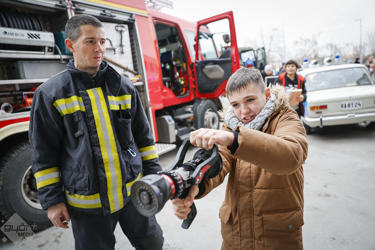 2022-ben és 2023-ban is nagy sikert aratott a “villogós” nap – az ötlet még 2022-ben fogant meg, hiszen akkor sok kisgyerek rajzolt “nekünk” tűzoltóautót. „Miért nem adunk nekik igazit?” – indult el a beszélgetés szerkesztőségünkben, amikor tanakodtunk. Így vettük fel a kapcsolatot a győri katasztrófavédelmi kirendeltséggel, majd az ötlet továbbfejlődött, és csatlakoztak a megyei rendőrség, valamint a mentőszolgálat munkatársai is.