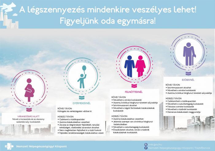 A tisztifőorvosi Facebook-oldalon kedden arra hívták fel a figyelmet, hogy a légszennyezés mindenkire veszélyes lehet. Az NNK ábráján az idősekkel, a felnőttekkel, a gyermekekkel és a várandósokkal kapcsolatban is ismertették a rövid és hosszú távú veszélyeket. Jellemző például, hogy a légszennyezettség hosszú távon növeli a tüdőrák kockázatát, és a gyermekek fejlődését is több szempontból veszélyezteti.