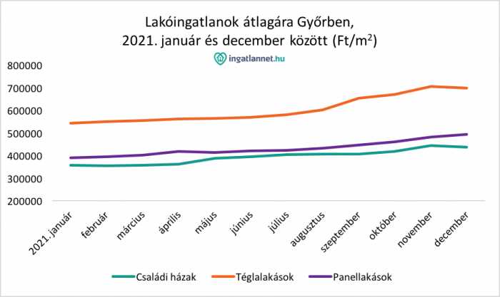 Az összes lakóingatlan-típus közül a téglalakások és a panellakások drágultak meg leginkább az elmúlt egy évben. Közel 30%-kal emelkedtek az átlagárak a győri lakáspiacon. Ennek eredményeképpen a téglaépítésű lakások decemberi átlagára 700 ezer Ft/m2, a paneleké pedig kis híján fél millió Ft/m2 lett.