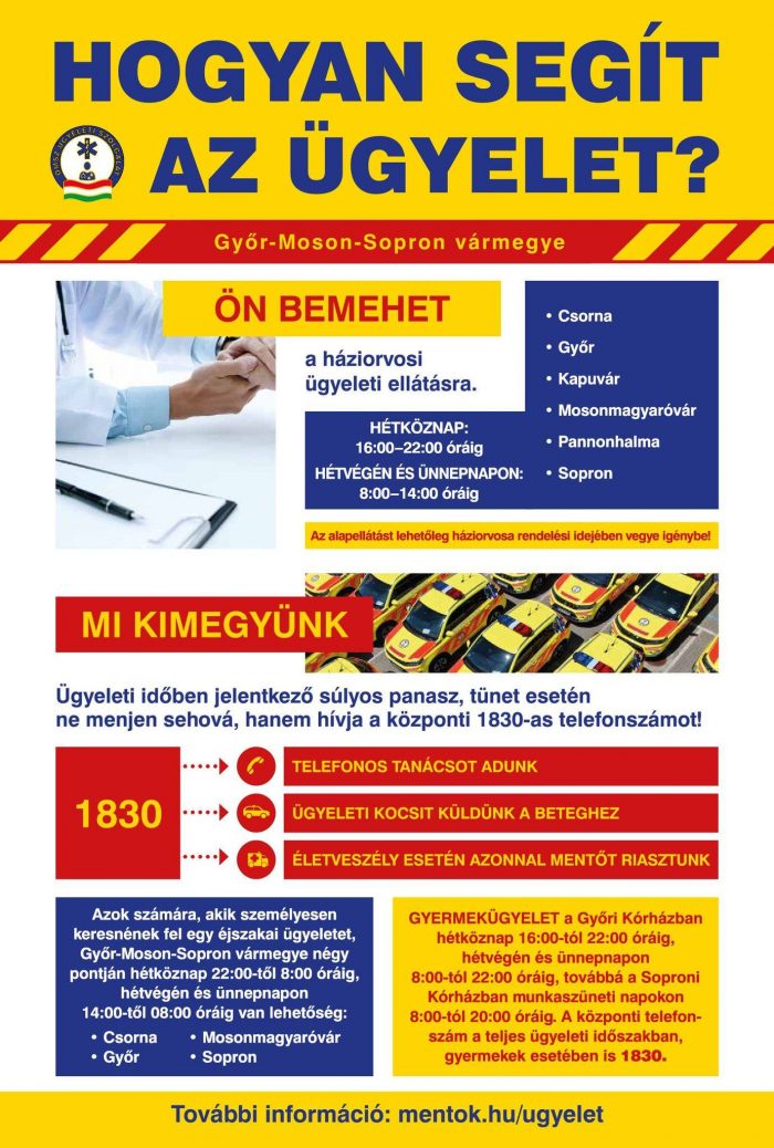 A legfontosabb változás, hogy az új ügyelet központi telefonszáma felnőttek és gyermekek esetében is a 1830. Ezen a számon a beteg szakszerű tanácsot kap panaszai enyhítésére, szükség esetén a tartózkodási helyére sürgősségi ügyeleti autót, vagy életveszély esetén azonnal mentőt küldenek. A telefonszám a teljes ügyeleti időszakban, hétköznap 16 óra és másnap reggel 8 óra között, szombat–vasárnap, ünnepnapon egész nap hívható. Az új ügyeleti rendszer felépítésének és működésének az egyes csatlakozó vármegyékre vonatkozó részletei a www.mentok.hu/ugyelet linkre kattintva is elérhetőek.