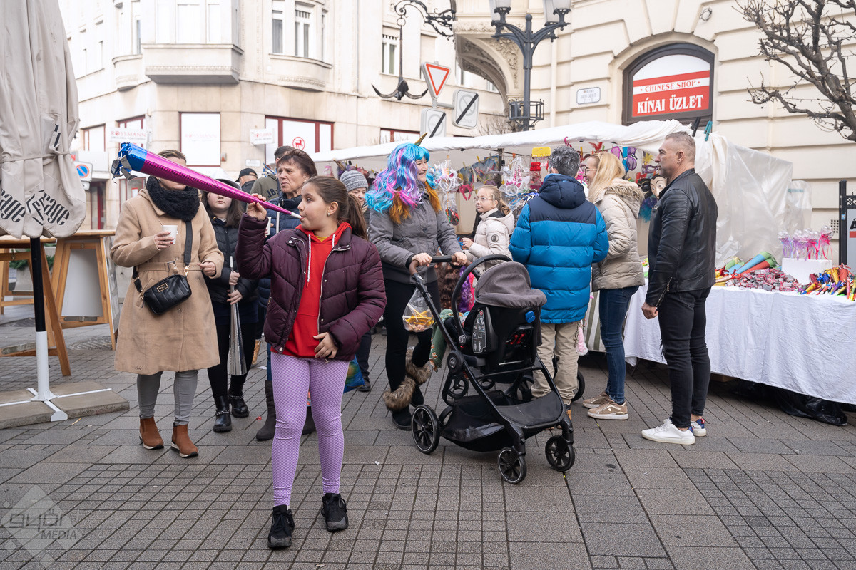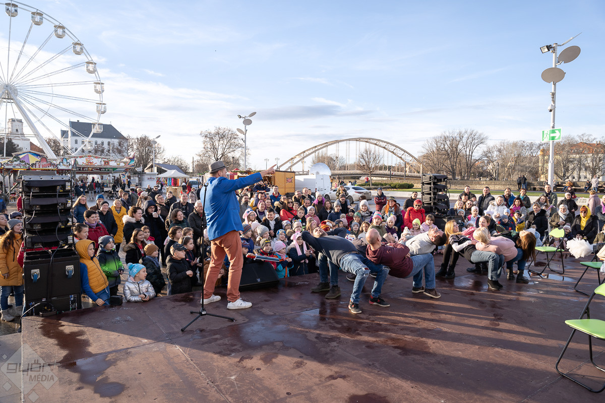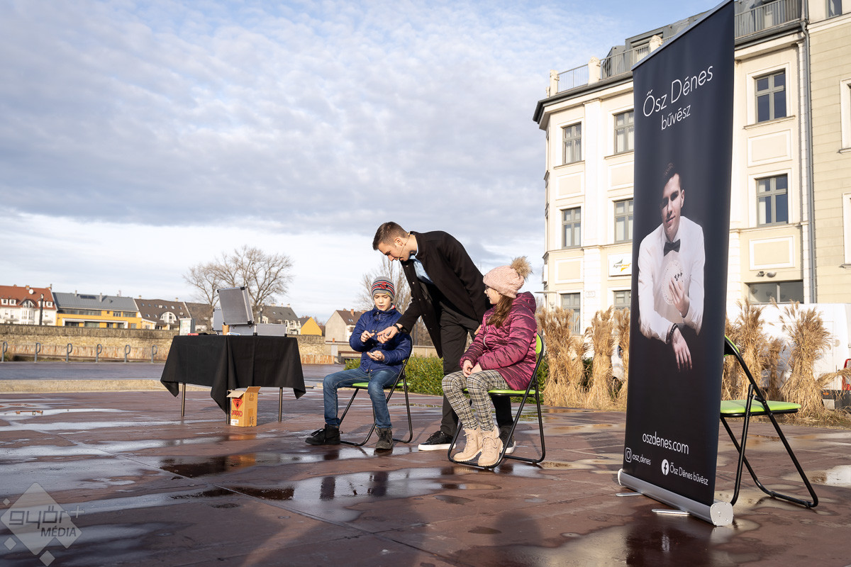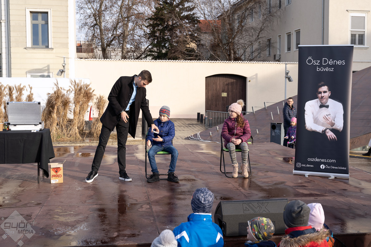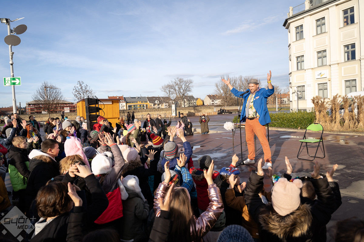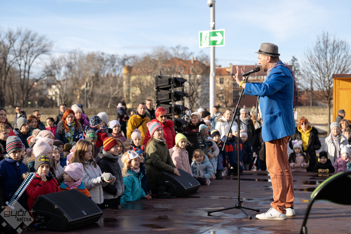 A Dunakapu téren is nagy volt a sürgés-forgás az év utolsó napjának délutánján, hiszen a színpadon előadók váltották egymást. A családoknak hirdettek programokat, s az idő is kegyes volt: szinte tavaszias levegőben szórakozhattak a kicsik és nagyobbak is.