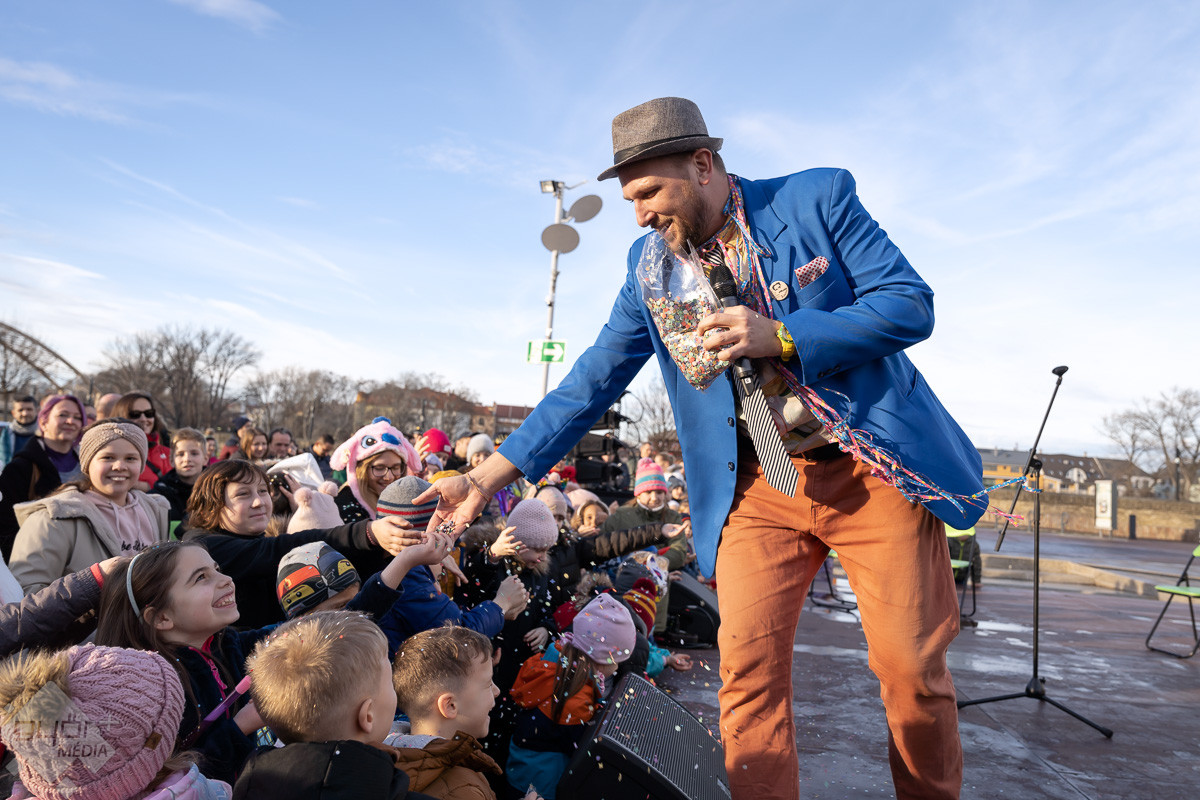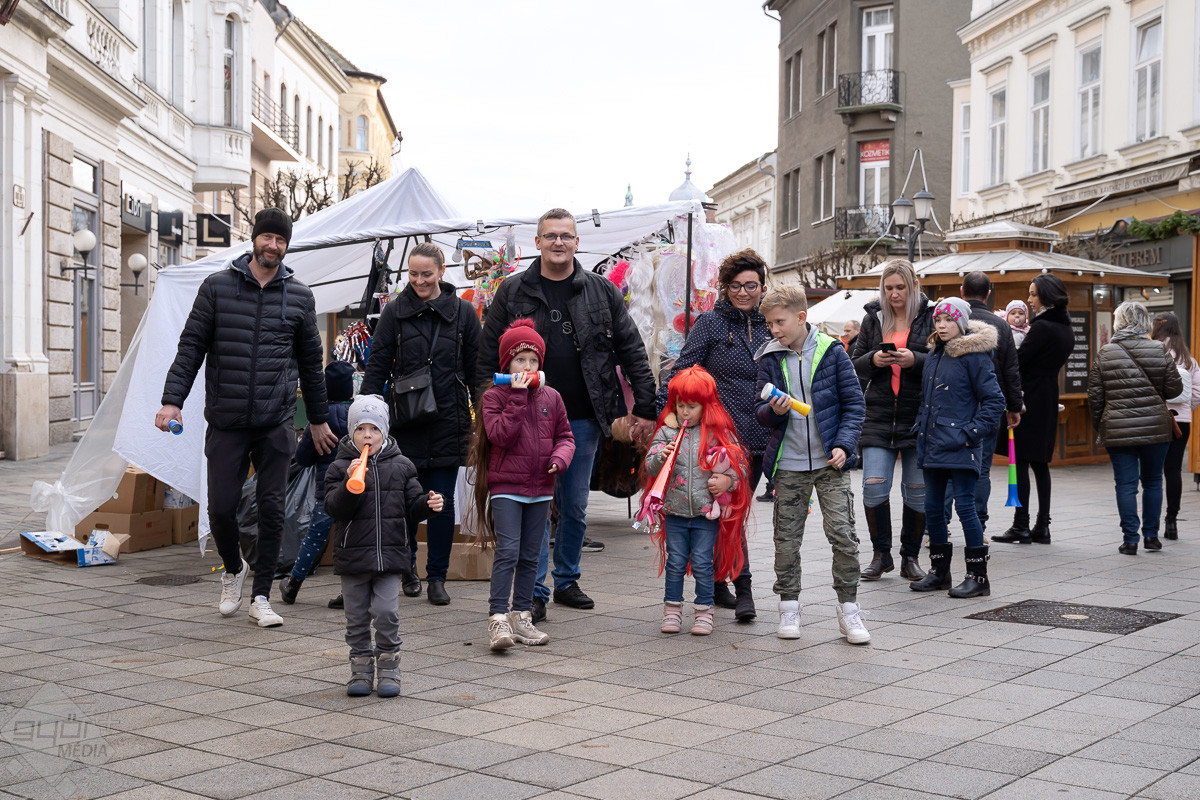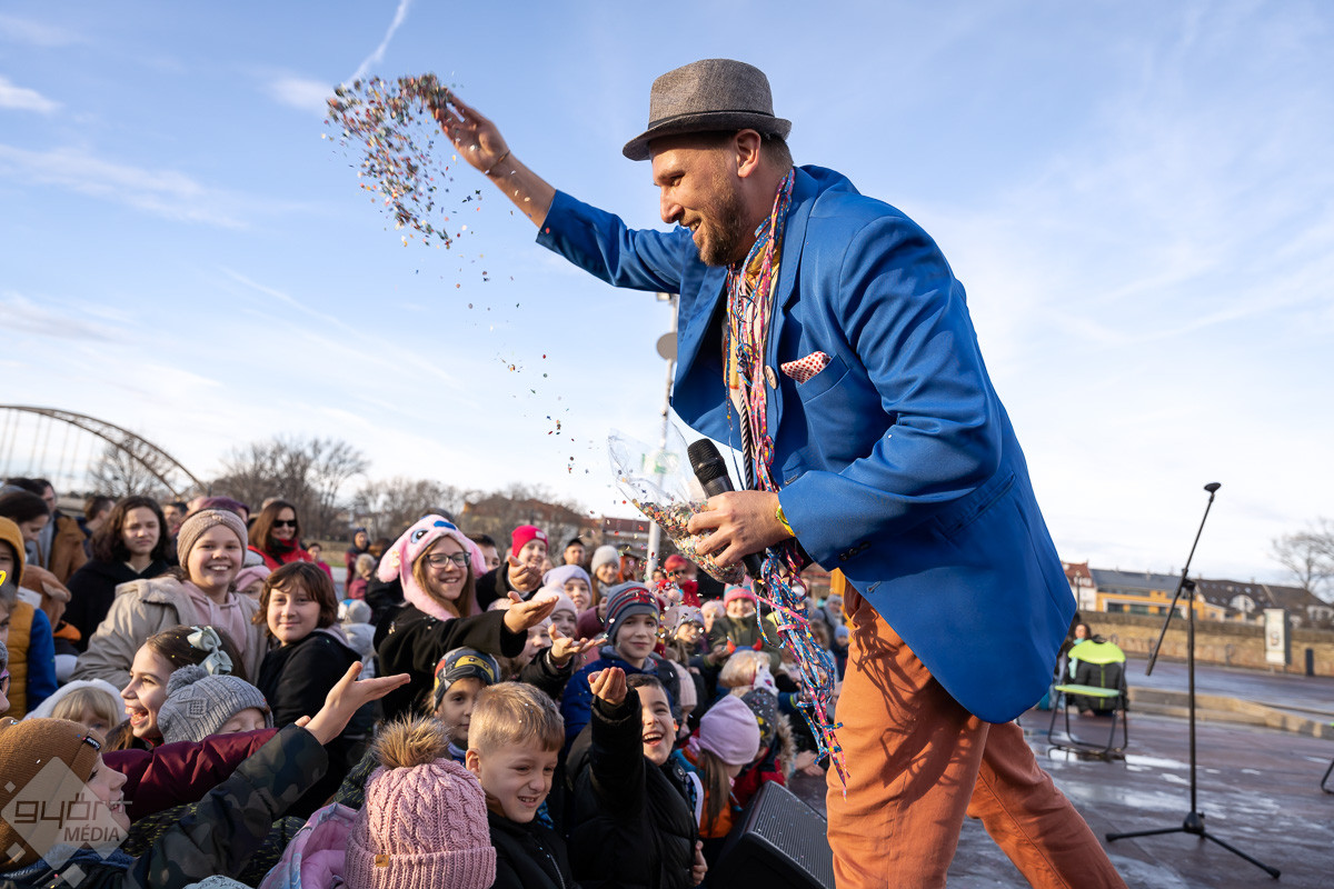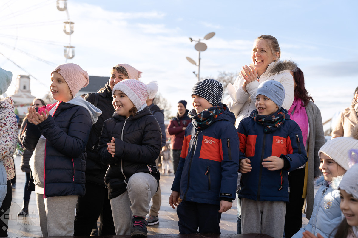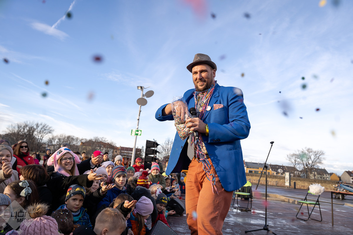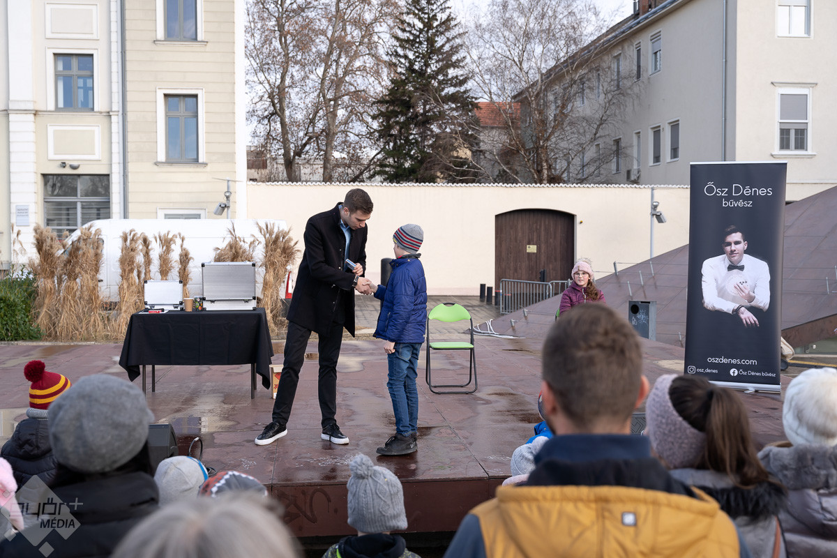 A Dunakapu téren is nagy volt a sürgés-forgás az év utolsó napjának délutánján, hiszen a színpadon előadók váltották egymást. A családoknak hirdettek programokat, s az idő is kegyes volt: szinte tavaszias levegőben szórakozhattak a kicsik és nagyobbak is.