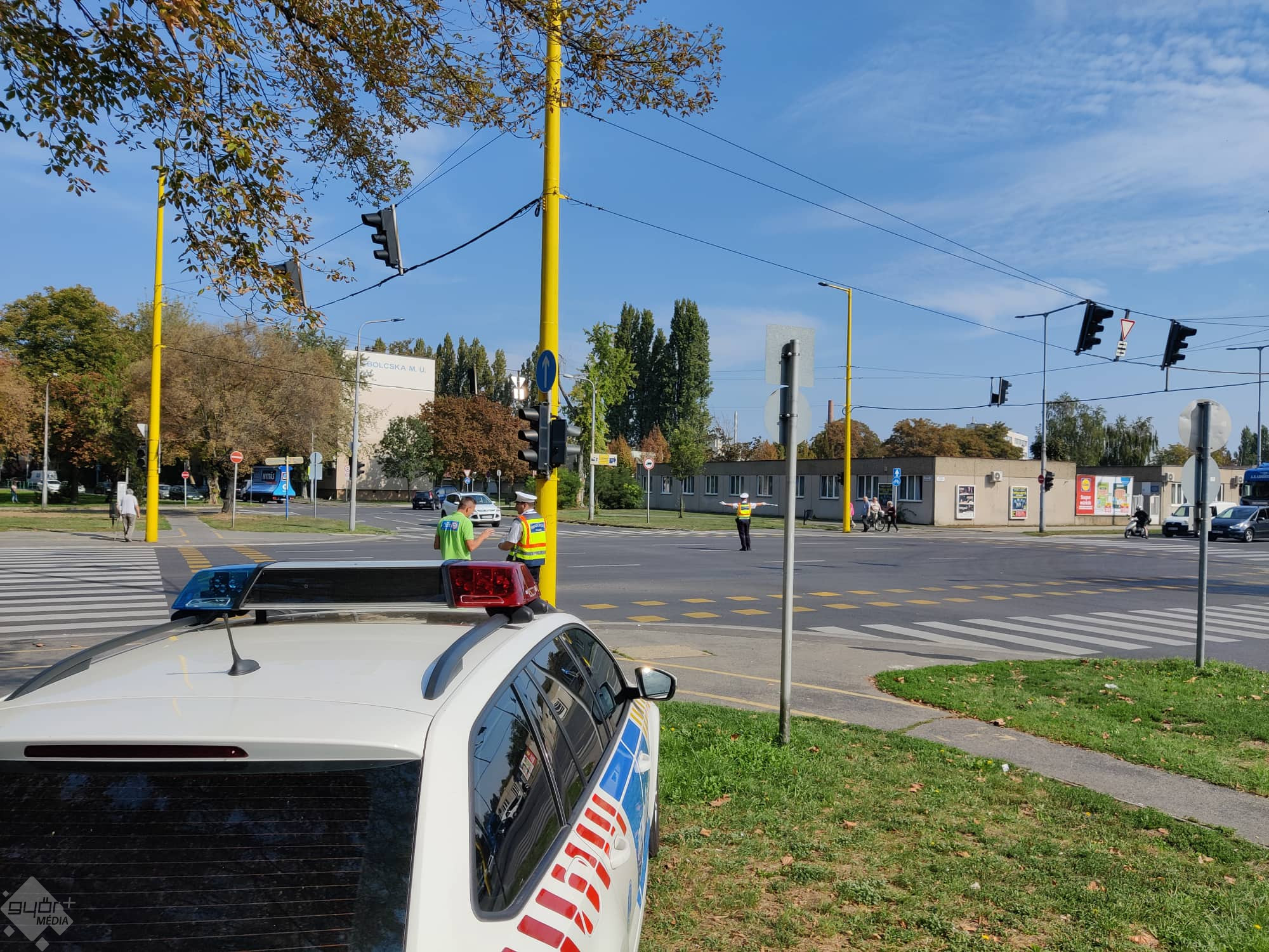 Rendőri irányítás mellett halad a forgalom Győr egyik forgalmas útszakaszán.