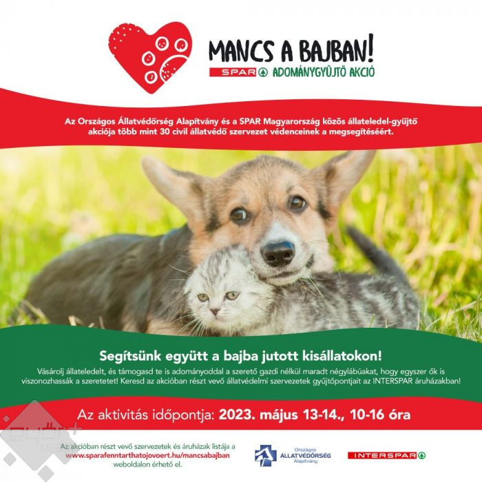 Az Országos Állatvédőrség Alapítvány és a SPAR Magyarország idén májusban ismét közös állateledel-gyűjtő akciót hirdet, ezzel több mint 30 civil állatvédő szervezet védenceinek segítve. A kétnapos gyűjtésben részt vesz két győri csapat is, a Győri Puha Praclik Egyesület és a Kutymorgók Egyesület.