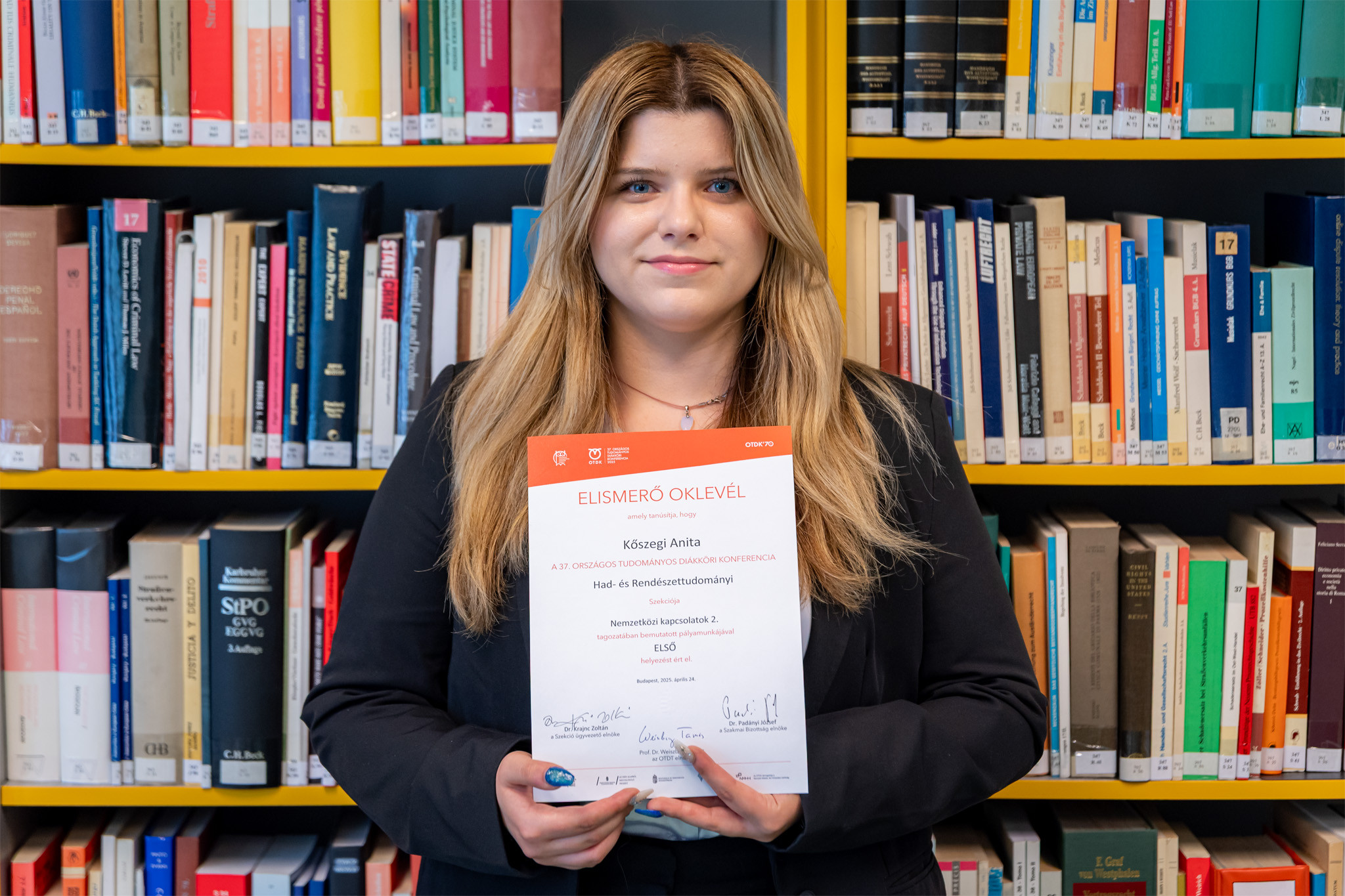 A kétévente, minden páratlan esztendőben megrendezett OTDK Magyarország legnagyobb tudományos rendezvénysorozata, a hazai tehetséggondozás legfontosabb fóruma, ahol a hallgatók ismertethetik kutatási eredményeiket. A Széchenyi István Egyetem Deák Ferenc Állam- és Jogtudományi Karának tehetséges hallgatói rendszeresen részt vesznek a megmérettetésen, és nemcsak a Jogtudományi Szekcióban – ahol idén több első és dobogós helyezést, valamint különdíjat érdemeltek ki –, hanem más szekciókban is. Ezekben ezúttal 30 dolgozattal képviselték az intézményt. A legsikeresebben Kőszegi Anita szerepelt, aki a legjobbnak bizonyult a Had- és Rendészettudományi Szekció Nemzetközi Kapcsolatok II. Tagozatában „A gyermekjogok védelme és a megsértésükért viselt nemzetközi jogi felelősség kérdése az orosz–ukrán konfliktus fényében” című dolgozatával. Témavezetői dr. Ganczer Mónika egyetemi docens és dr. Takó Dalma egyetemi adjunktus voltak.