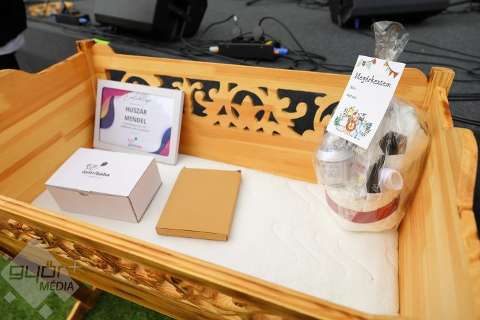 A csodás bölcső most néhány hónapig Huszár Mendel baba fekhelye lesz, ami mellé a család egy emléklapot, egy pelenkatortát és egy Győribababoxot is kapott ajándékba.