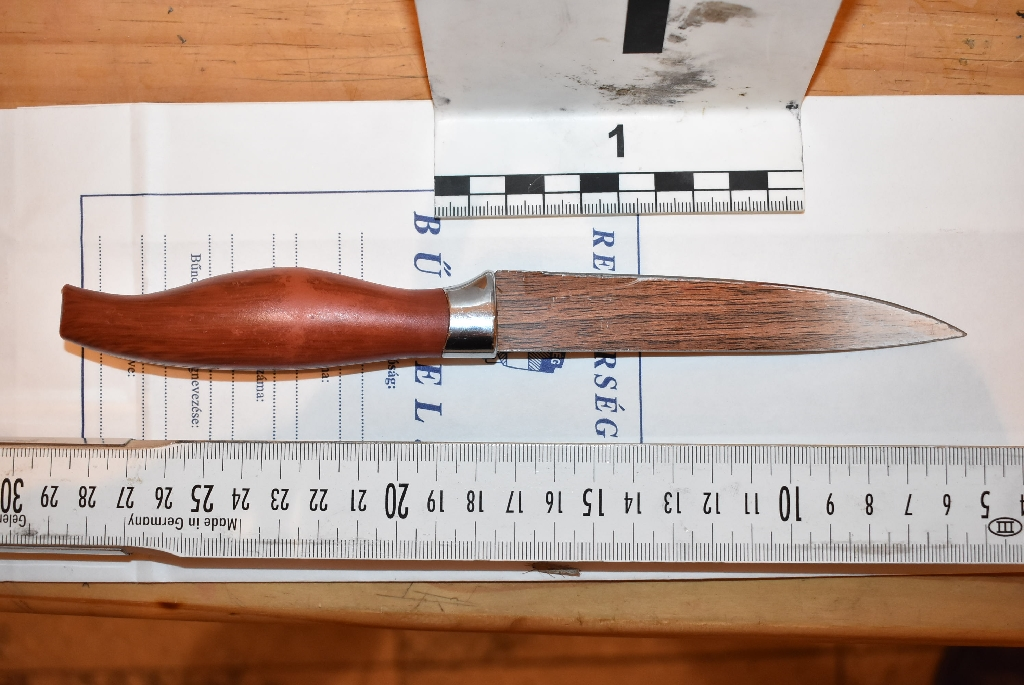 A vádlott ekkor – ismét féltékenységétől motiváltan – az asztaltól felugrott és a sértettet szidalmazta, majd a helyiségből eltávozott és pillanatok múlva egy 13 cm pengehosszúságú késsel visszatérve a sértett elé állt és azt a torkánál elhúzta, miközben azt kiabálta: „Elvágom a torkod, leszúrlak, megöllek!”.
