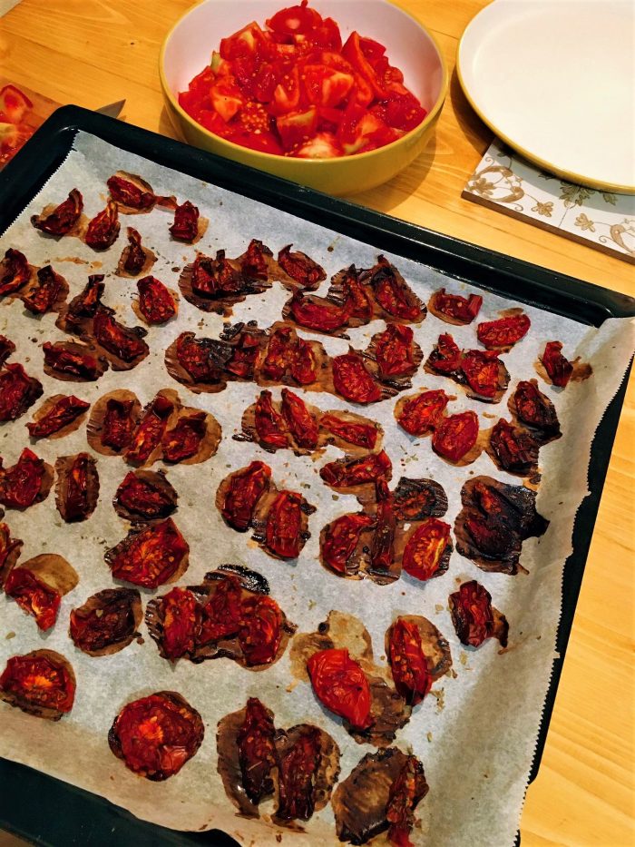A paradicsomot alaposan megmosom, a koktélparadicsomokat kettévágom, a normál méretű paradicsomokat vékony cikkekre, azaz 6 vagy 8 felé. Sütőpapírral bélelt tepsire sorakoztatom őket és enyhén meghintem sóval, pici cukorral mindegyik tepsi paradicsomot. A sütőt 120 fokra előmelegítem, ha van, akkor grillfokozatra vagy légkeverésre. A sütő ajtaját egy fakanállal kitámasztom az első 2 órában, majd a következő 3 órában már csak egyszerűen sütöm. Sajnos ez hosszú idő, ezért érdemes 3 tepsivel dolgozni is akár, hogy gazdaságosabb legyen, de aki szereti az aszalt paradicsomot, annak ez bizony megéri. Miután letelt az idő és nagyon szárazra aszalódtak, akkor megvárom, amíg kihűlnek és üvegekbe rakom. Felöntöm annyi olajjal, hogy teljesen elbukjanak és alaposan lezárom. Amennyiben jól sikerült, egy évig a kamra polcán vígan elállnak. Érdemes azonnal kipróbálni egy adagot és még meleget apró kockákra vágni, fetasajttal, tejföllel kikeverni és pirítóssal enni.