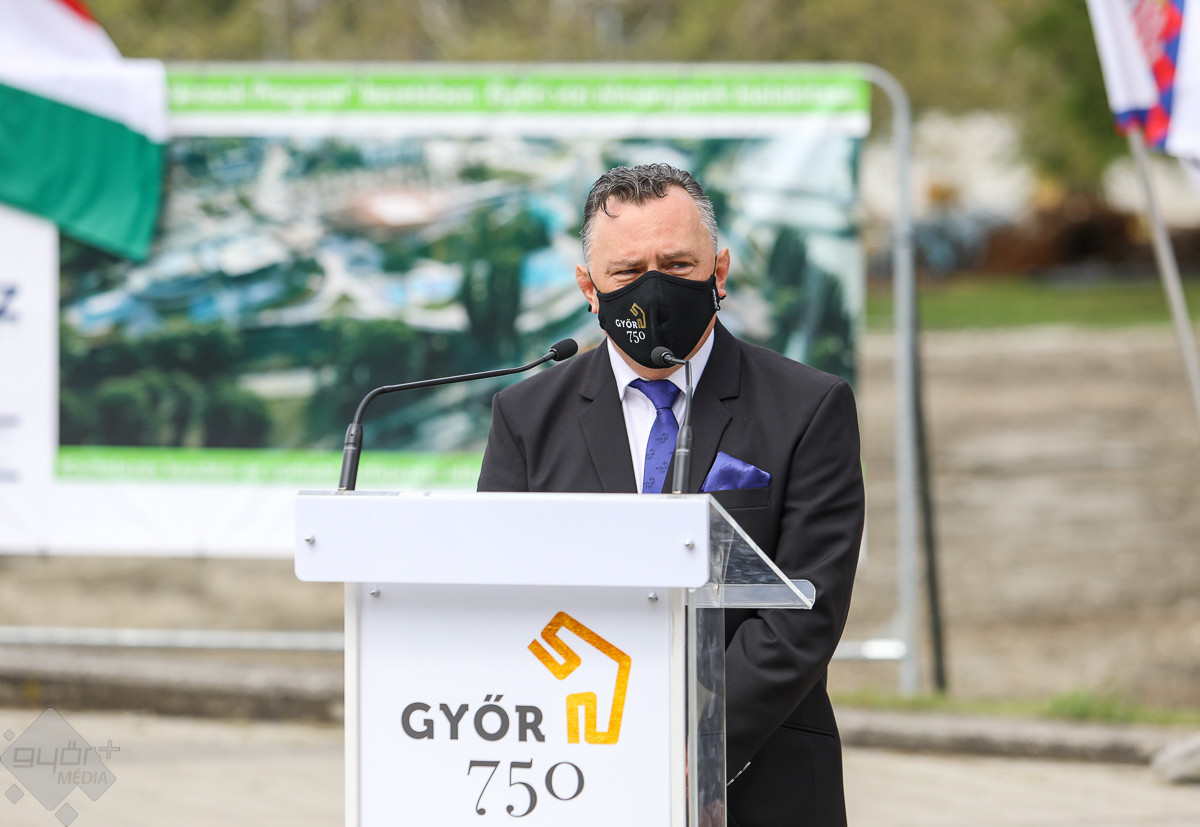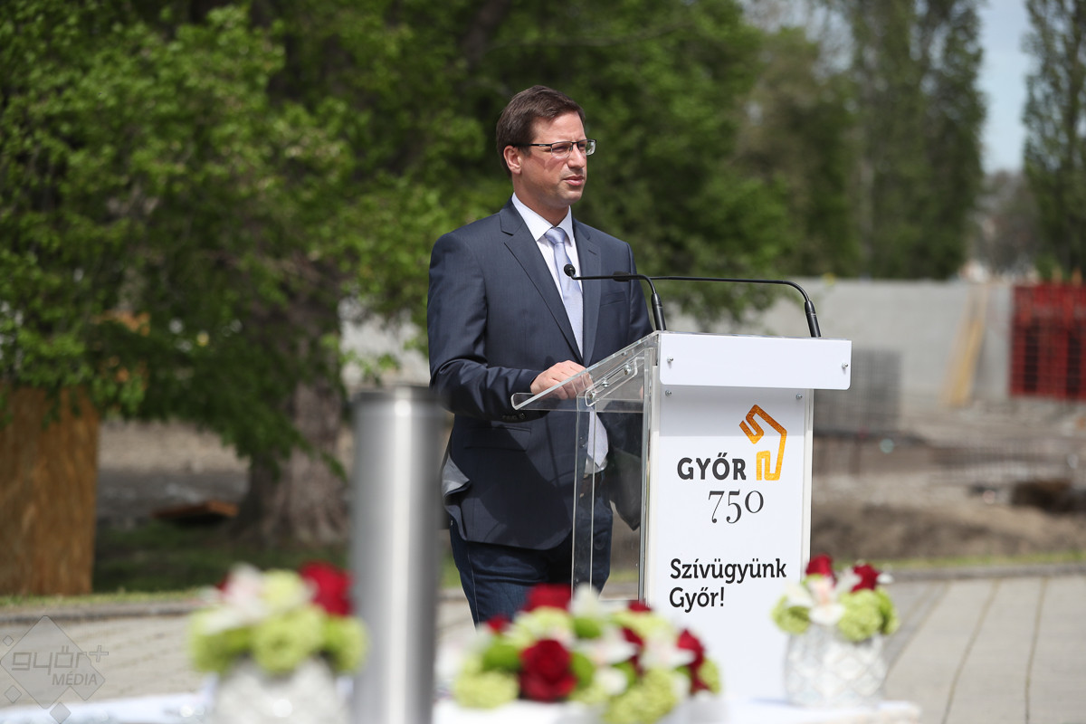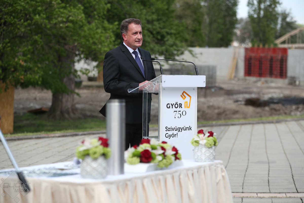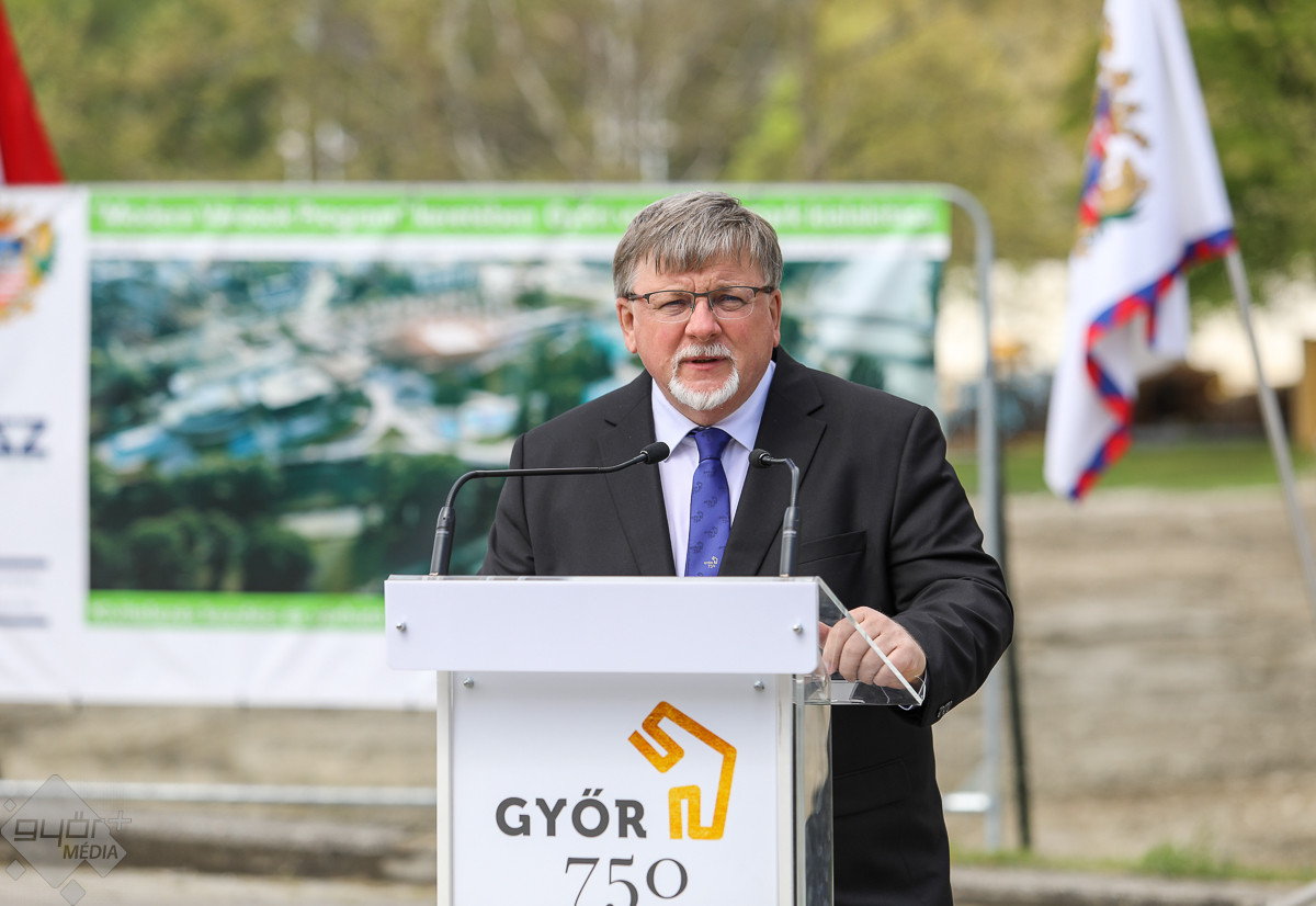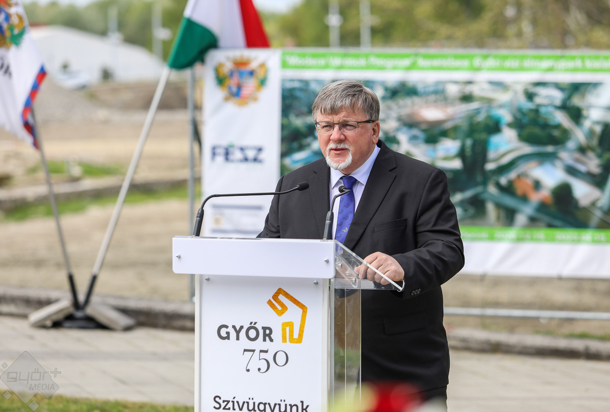 Dr. Dézsi Csaba András köszönetet mondott a miniszternek, és rajta keresztül Orbán Viktor miniszterelnöknek a kormányzat támogatásáért, valamint a város országgyűlési képviselőinek, és mindazoknak, akik megteremtették a fejlesztés lehetőségét. A polgármester a munkaterületen látható „fallal” kapcsolatban elmondta, nem csak egy vízi élménypark épül, hanem egy olyan gátrendszer, ami megvédi a fürdőt. Emlékeztetett arra, hogy a korábbi strandot az árvíz időről időre elöntötte, ami jelentősen hozzájárult az állapota leromlásához, ezért ez felelős gondolkodást jelez. Kiemelte, fontos, hogy az új fürdőt is magukénak érezzék a győriek és, hogy meg is tehessék, hogy látogatják majd az élményparkot. A polgármester sok sikert kívánt a beruházáshoz, az időkapszulába pedig a városháza ezüst emlékérmét, valamint a 750-es évforduló városi emlékérmét helyezte.