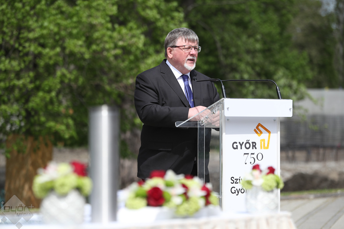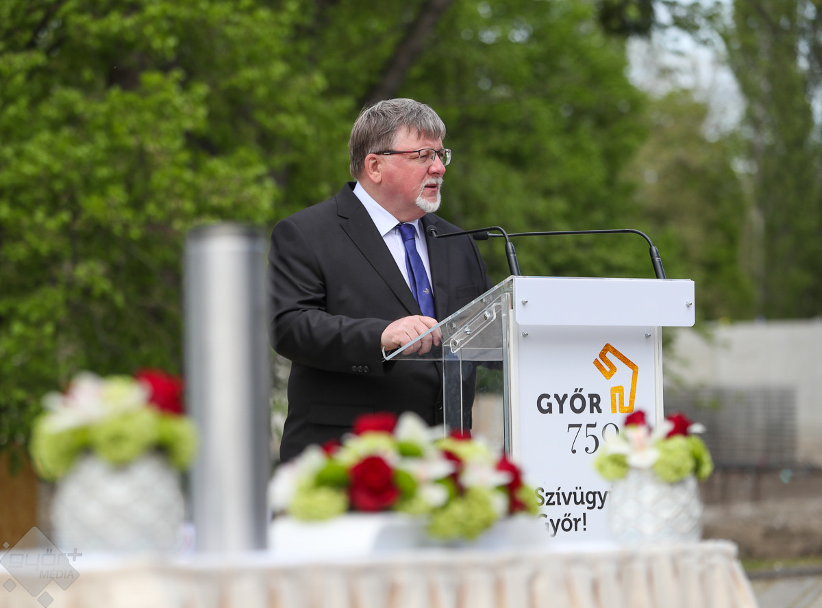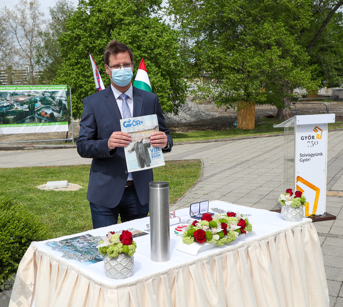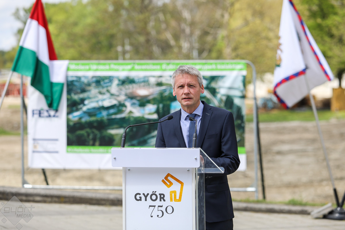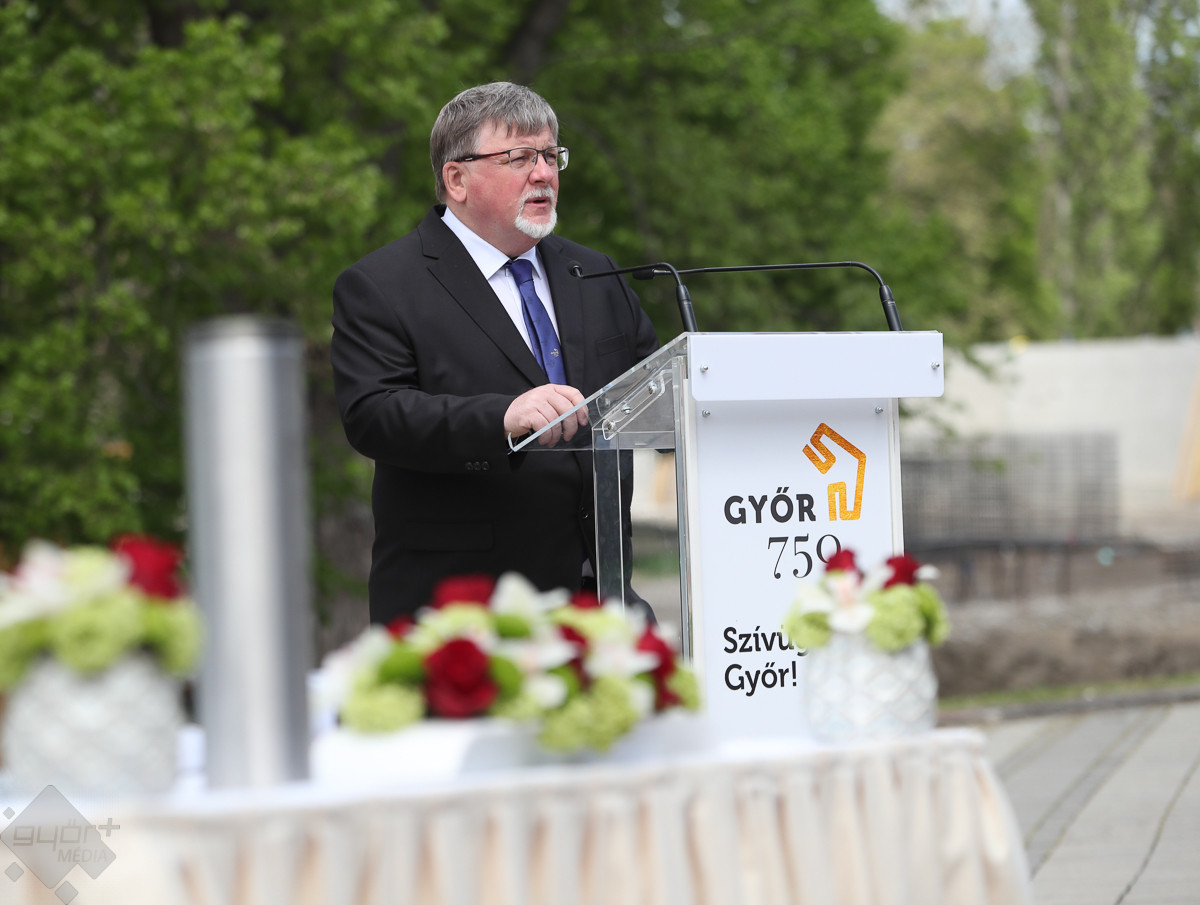 Dr. Dézsi Csaba András köszönetet mondott a miniszternek, és rajta keresztül Orbán Viktor miniszterelnöknek a kormányzat támogatásáért, valamint a város országgyűlési képviselőinek, és mindazoknak, akik megteremtették a fejlesztés lehetőségét. A polgármester a munkaterületen látható „fallal” kapcsolatban elmondta, nem csak egy vízi élménypark épül, hanem egy olyan gátrendszer, ami megvédi a fürdőt. Emlékeztetett arra, hogy a korábbi strandot az árvíz időről időre elöntötte, ami jelentősen hozzájárult az állapota leromlásához, ezért ez felelős gondolkodást jelez. Kiemelte, fontos, hogy az új fürdőt is magukénak érezzék a győriek és, hogy meg is tehessék, hogy látogatják majd az élményparkot. A polgármester sok sikert kívánt a beruházáshoz, az időkapszulába pedig a városháza ezüst emlékérmét, valamint a 750-es évforduló városi emlékérmét helyezte.