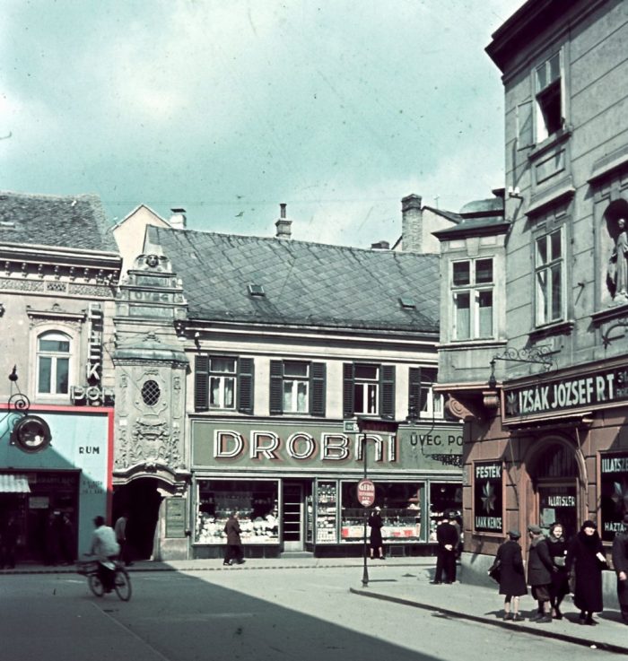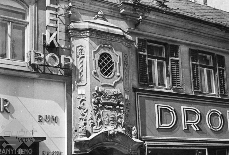 Egy egykori szórólap tanúsága szerint a szomszédos épület földszintjén működött porcelán és üveg kereskedés, ami Drobni Antal tulajdonosról kapta a nevét. A cégér építmény a rendelkezésre álló források szerint 1922-ben létesült, és nagyjából három évtizeden át hirdette a kereskedést. Megszűnése egybeesik a háború utáni idők államosításával, amely magának az üzletnek a megszűnését is jelentette.