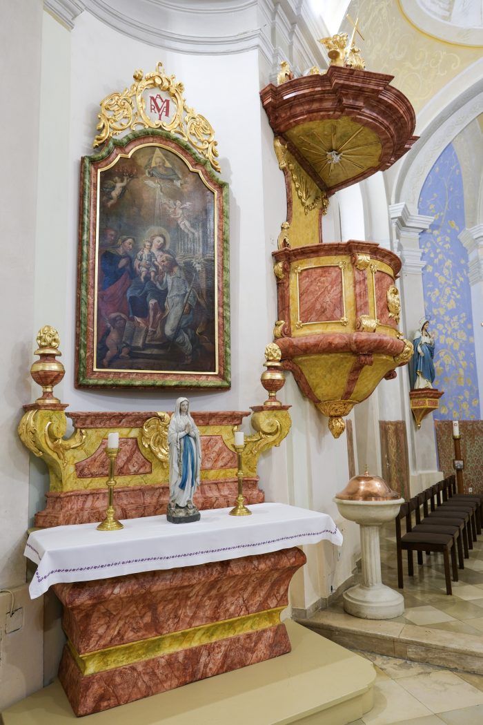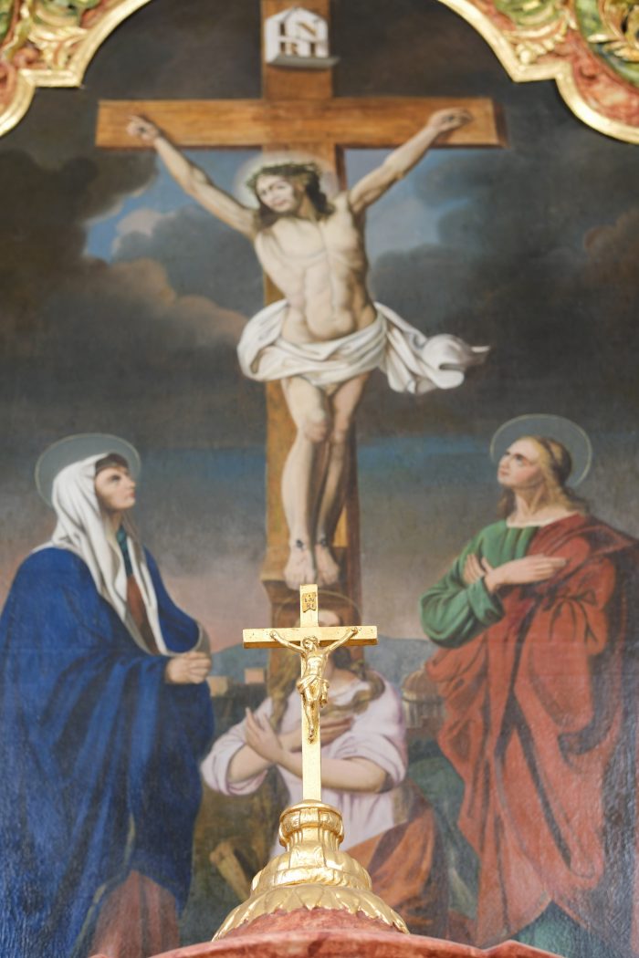 A templombelső jobbára a barokk kor stílusjegyeit mutatja. A főoltárkép a megfeszített Krisztust ábrázolja a kereszten. Az egyik mellékoltáron Szent Lászlót, a másikon a nagy szent családot láthatjuk. Utóbbi ritkaságnak számít, hiszen a kis Jézuson, a Szűzanyán és Szent Józsefen kívül Mária szüleit, Szent Annát és Szent Joachimot is megjeleníti.