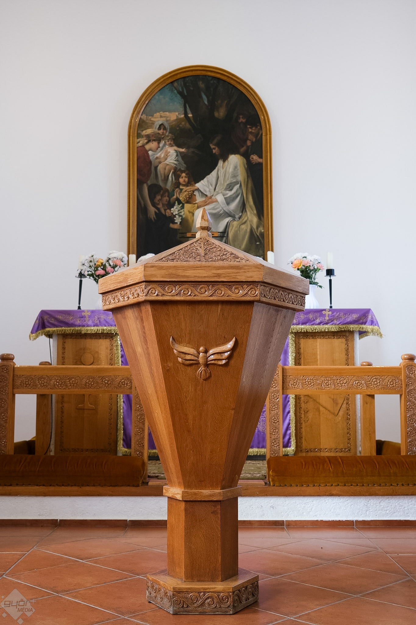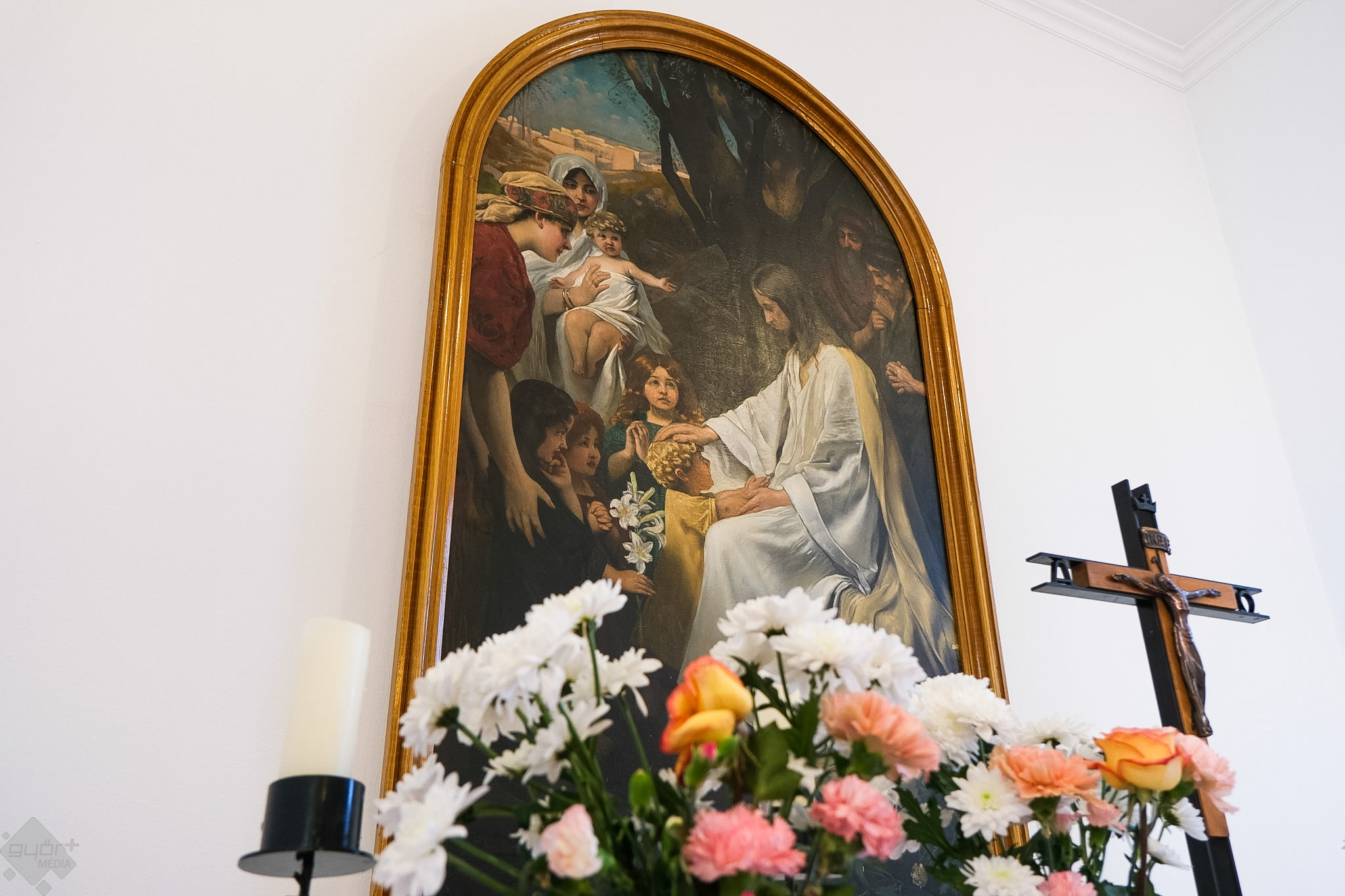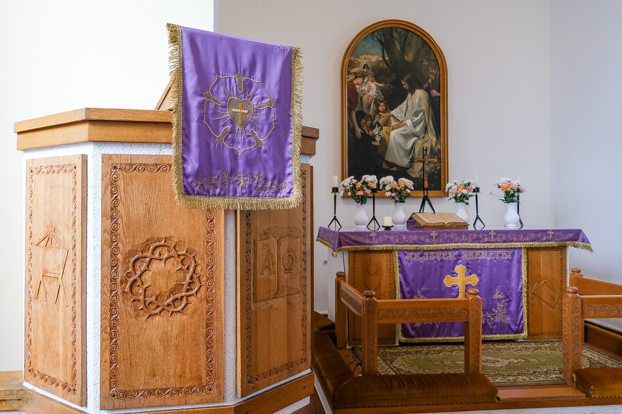 Az oltárkép Kapi Béla hagyatéka. A kommunisták által nyugalmazott, néhai püspök úgy végrendelkezett, az a gyülekezet kapja meg, aki először épít templomot. A szép festményen Jézus Krisztus megáldja a köréje gyűlt gyermekeket.