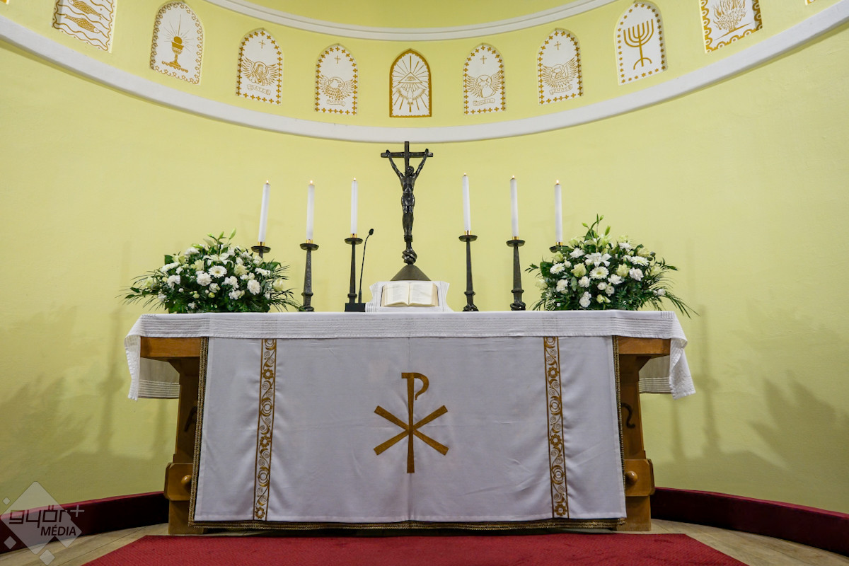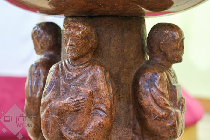 A vörös márvány keresztelőkút Borsos Miklós alkotása. A medencét oszlopként tartja a négy evangélista alakja, arcvonásaikat a szobrász a kor híres művészeiről mintázta. Mátéban Barcsay Jenőre, Márkban Kodály Zoltánra, Lukácsban Egry Józsefre ismerhetünk, míg Jánost saját magáról formázta. A medence fedőlapja domborított vörösrézből készült, rajta Jézus megkeresztelésének jelenete látható. A műveket Tihanyban készítette, vasúton érkeztek Győrbe, az állomáson még egy bombázást is szerencsésen átvészeltek. Ugyancsak Borsos munkája az oltár melletti bronz dombormű, mely az angyali üdvözletet ábrázolja.