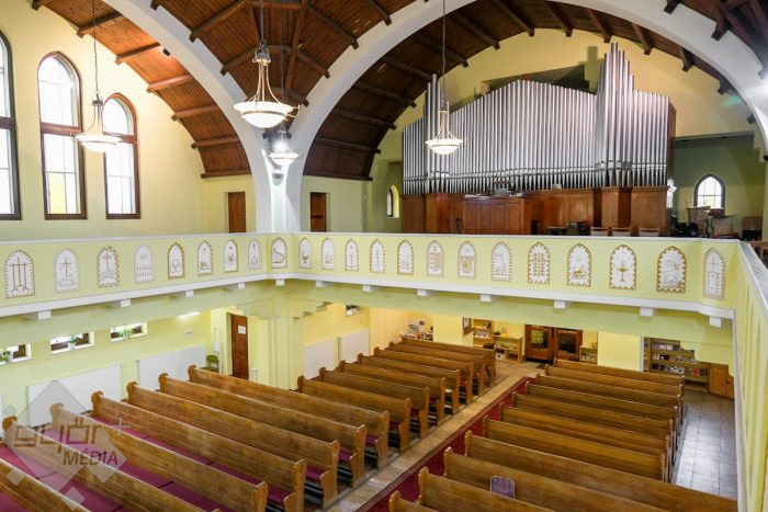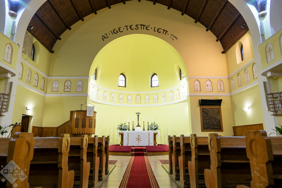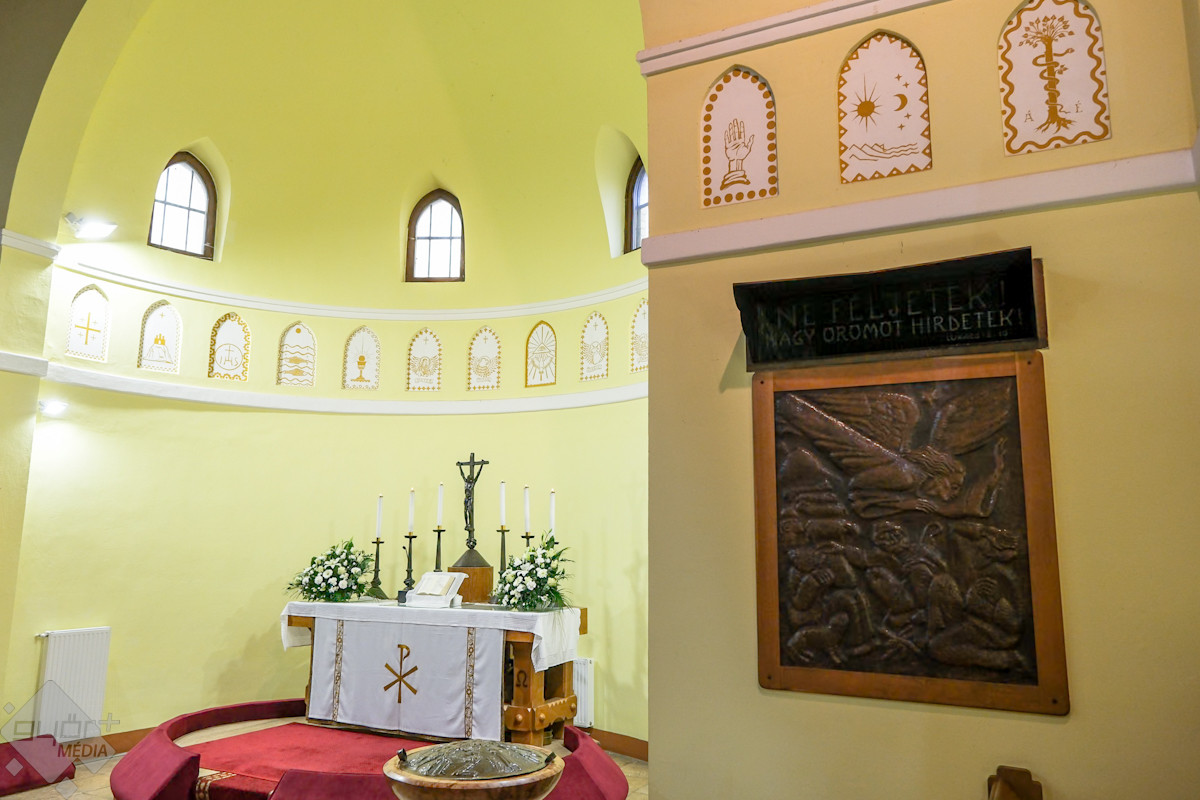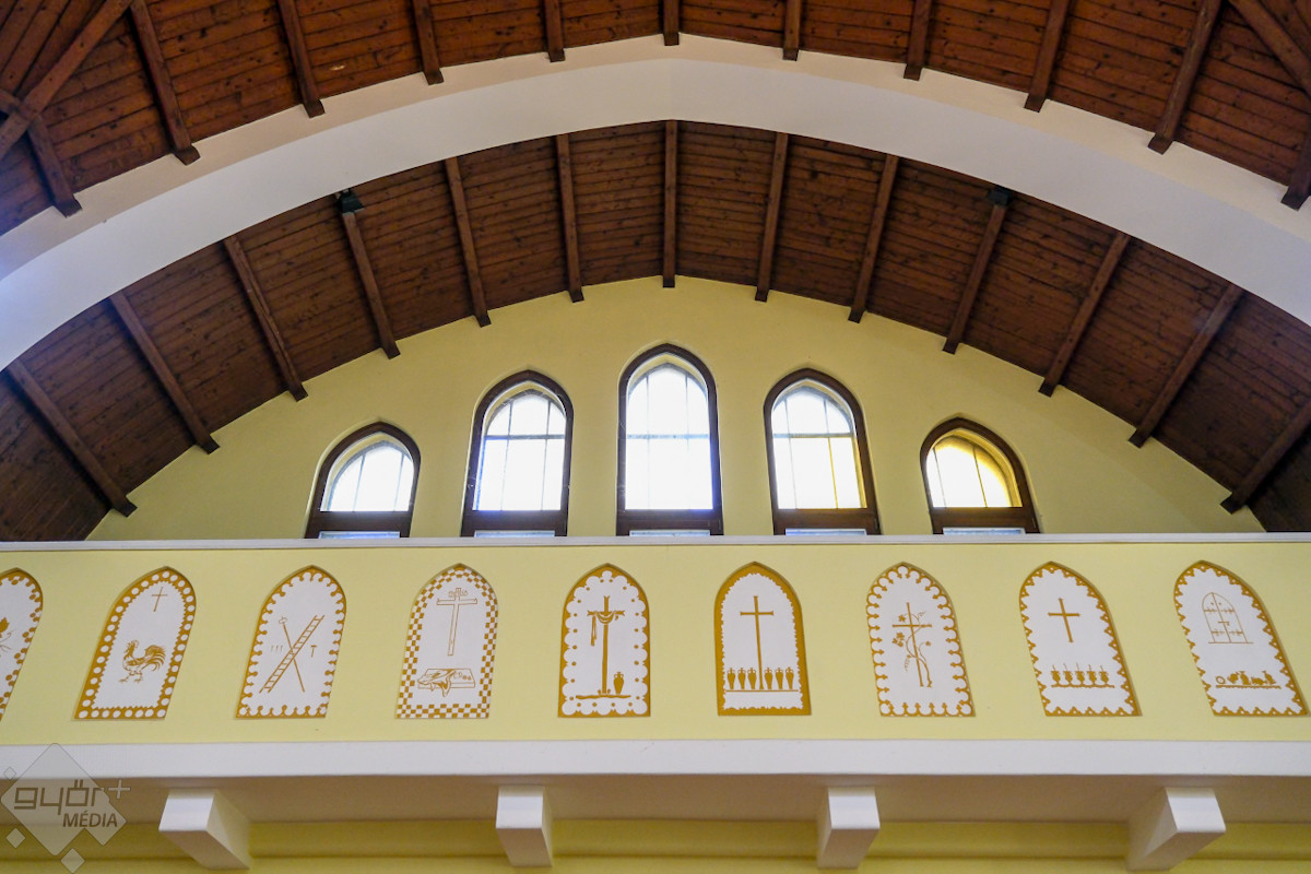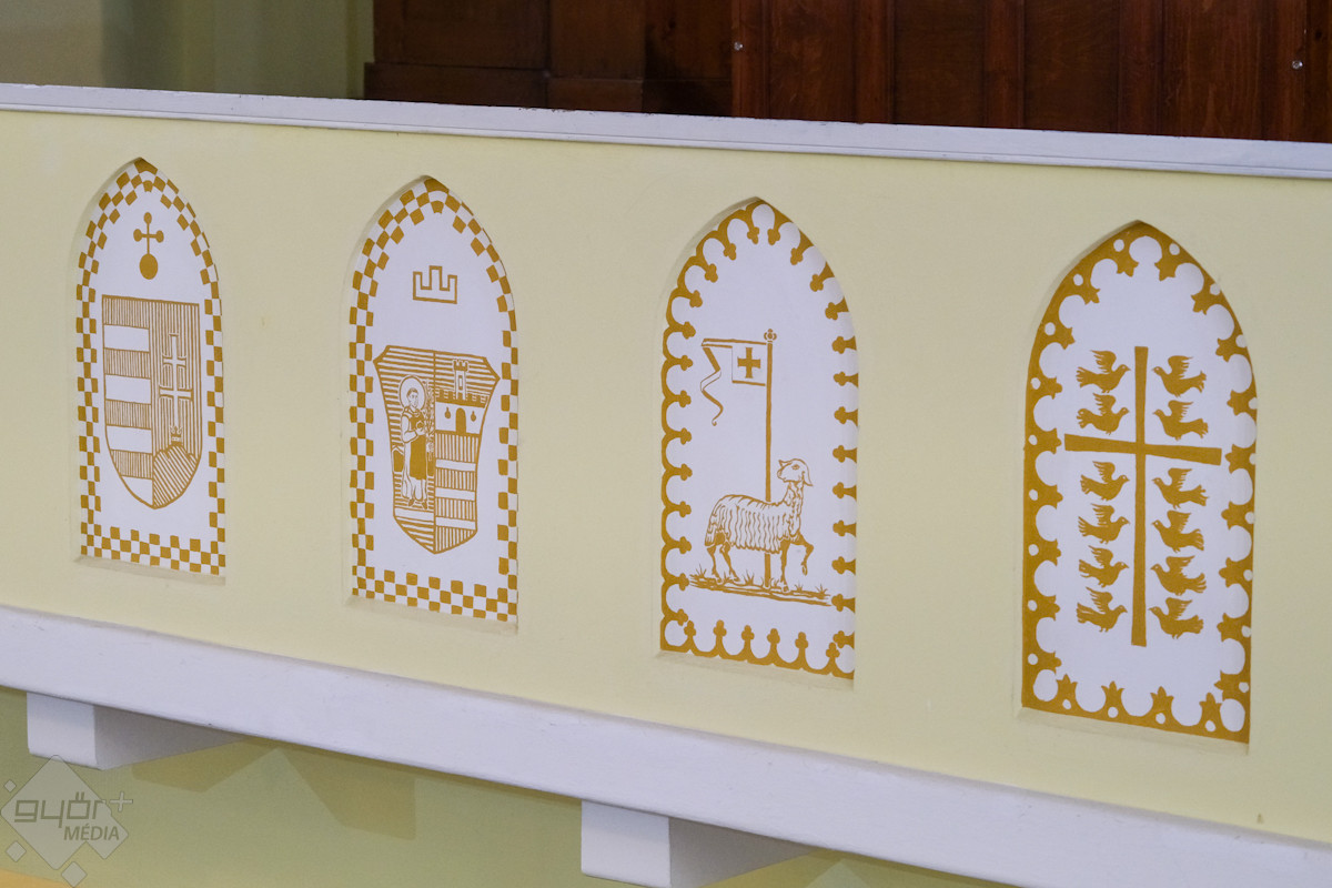 Az oltár, a szószék és a papi szék elkészítésével Kecskés János asztalosmestert, a festési munkálatok kivitelezésével Böröczki Ferencet bízták meg. 1950-ben készült el a karzaton végigfutó, pajzsmezőkbe helyezett egyházi szimbólumok különleges, 72 darabos sorozata, melyet Sándy tervei alapján szintén ő festett meg.