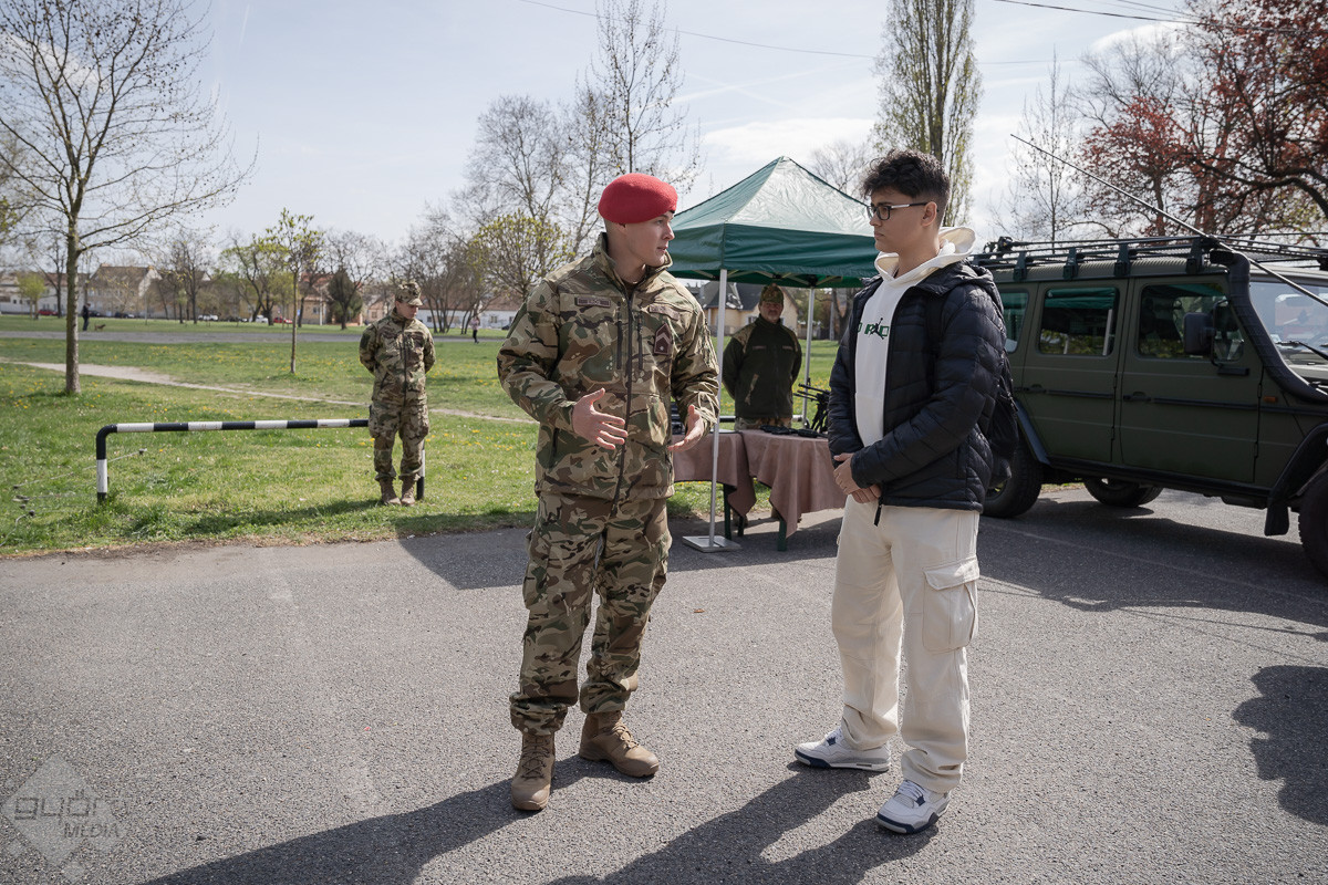 Kiss László hadnagy, a NASAMS légvédelmi rakétaosztály beosztott tisztje örömmel válaszolt a középiskolások és más érdeklődők kérdéseire. Mint elmondta: már gyermekkorától a katonai pálya vonzotta, és 2023 óta a Magyar Honvédség tisztje. A Nemzeti Közszolgálati Egyetemen végzett légvédelmi rakétásként, jelenleg a győri rakétaosztály tisztje.