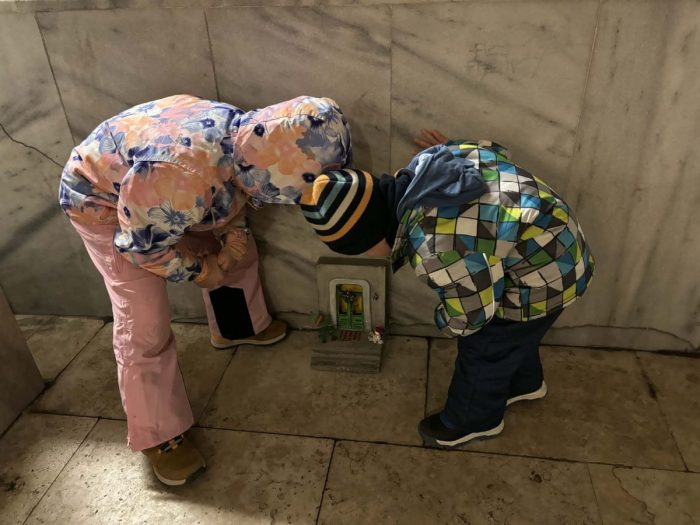A gyerekek egymással versengve, igazi nyomozókként próbálták meg felkutatni a manóajtókat, így fedeztük fel közösen például a manóséta során a város legkeskenyebb közét, de végigrohantunk a Sarkantyú közön, majd a „halas” szobrot is megtaláltuk.