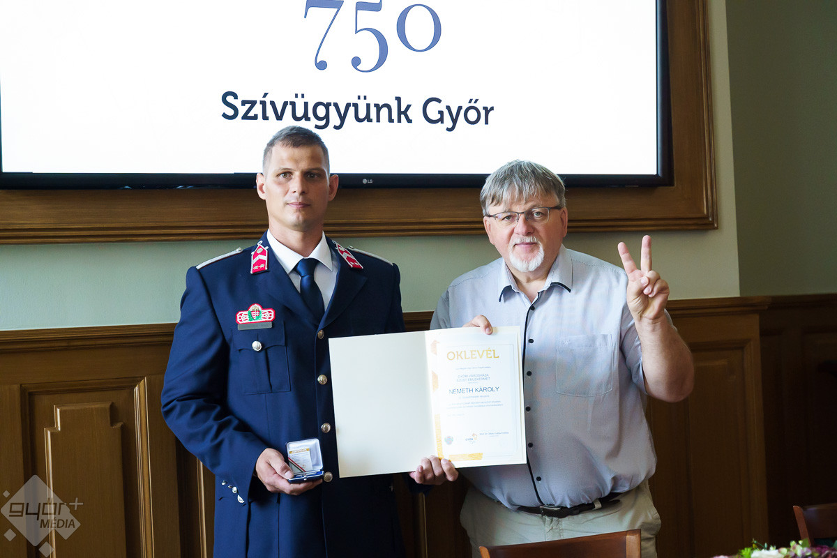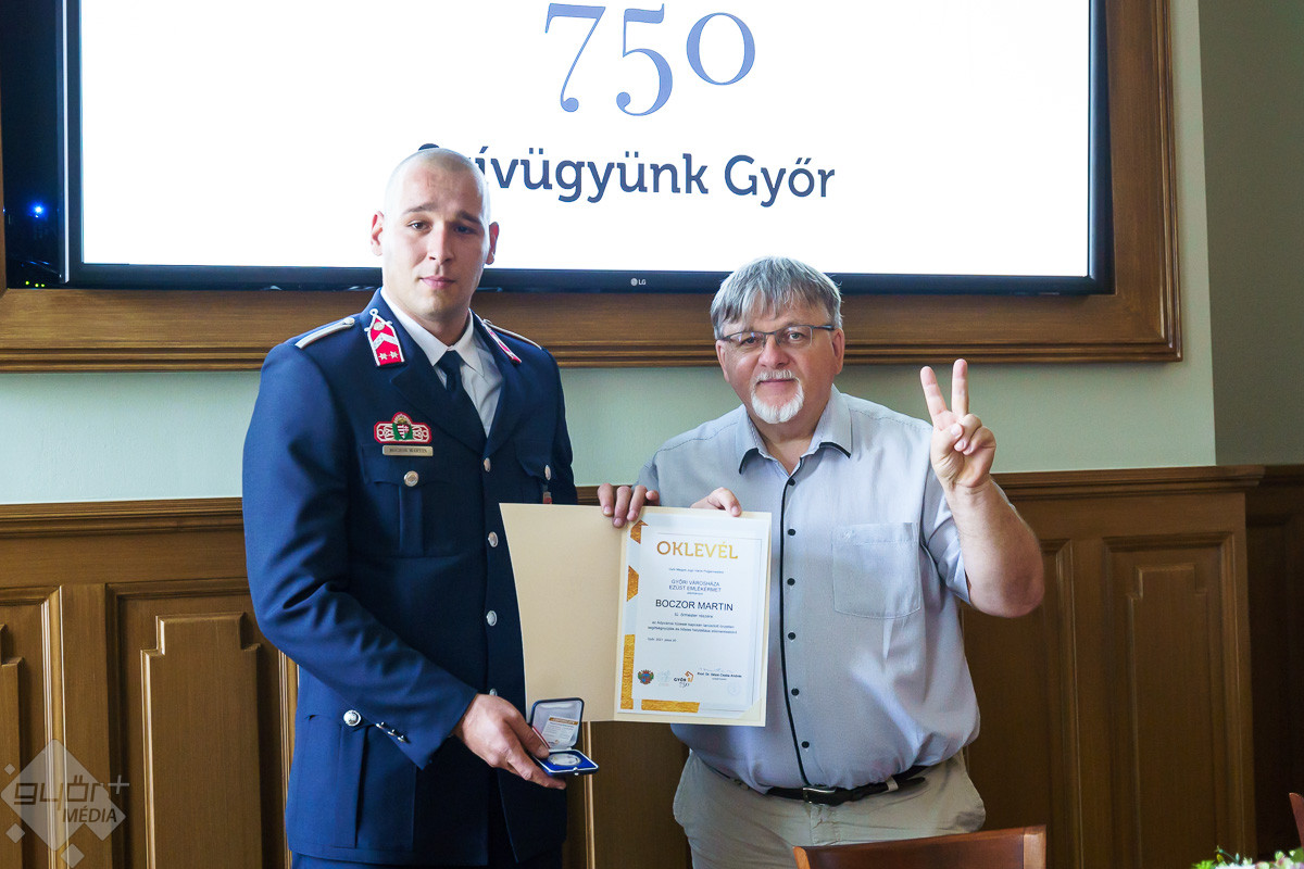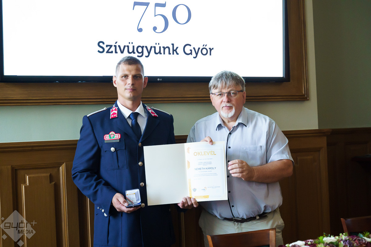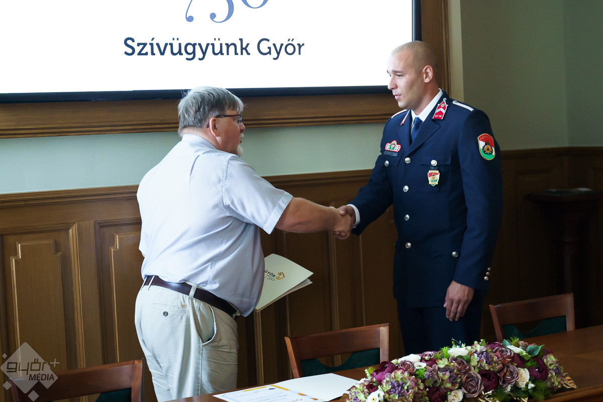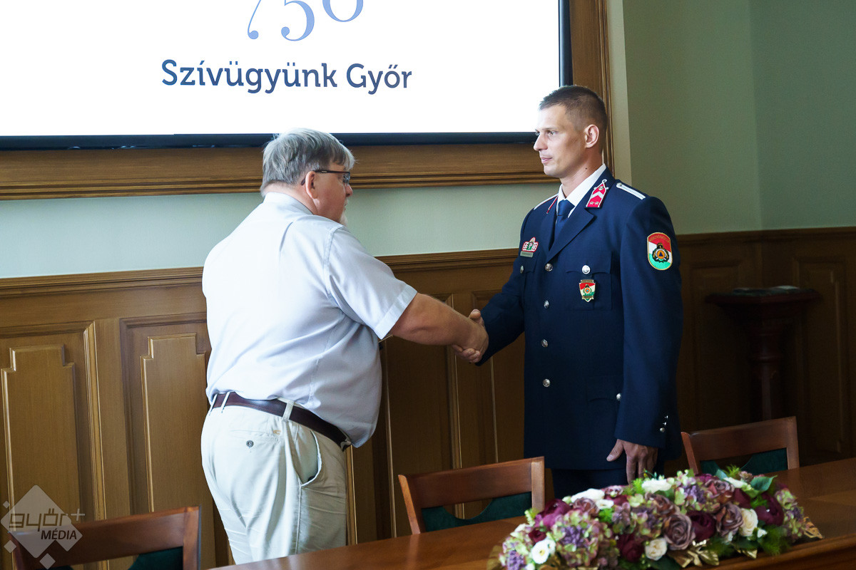 A győri hivatásos tűzoltók két kiválósága a város ezüst emlékérmét és pénzjutalmat vehetett át a polgármestertől, teljesítményükhöz pedig Radnóti Ákos alpolgármester, a körzet önkormányzati képviselője gratulált.