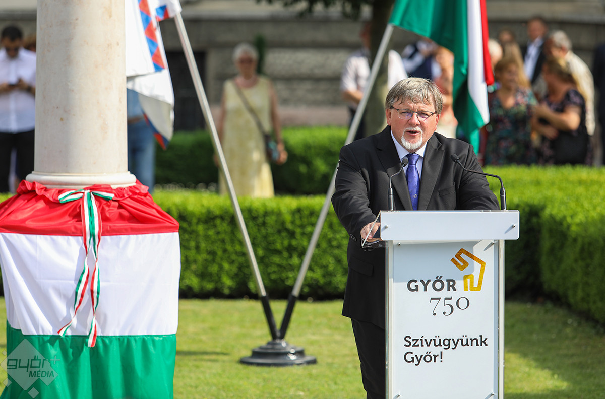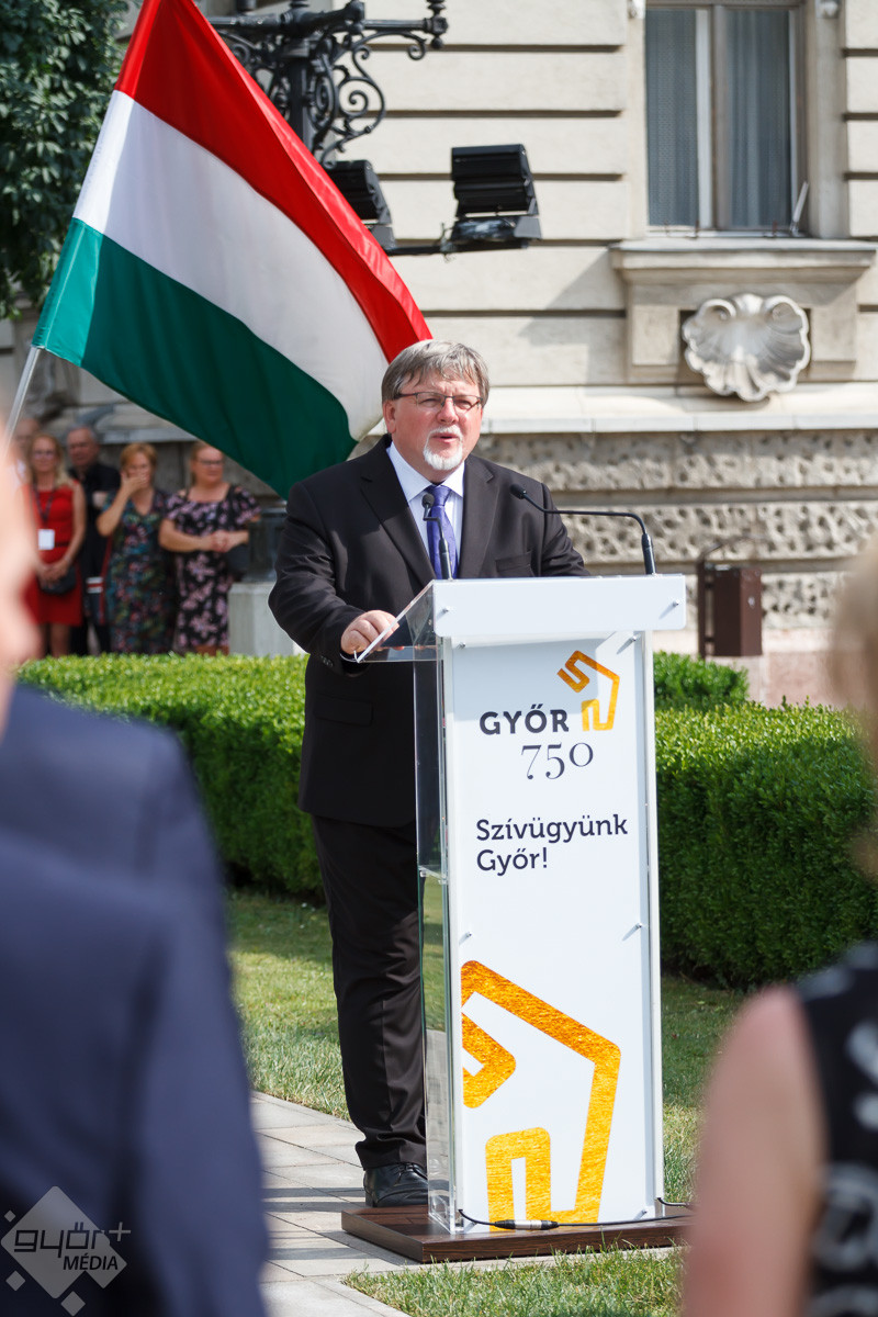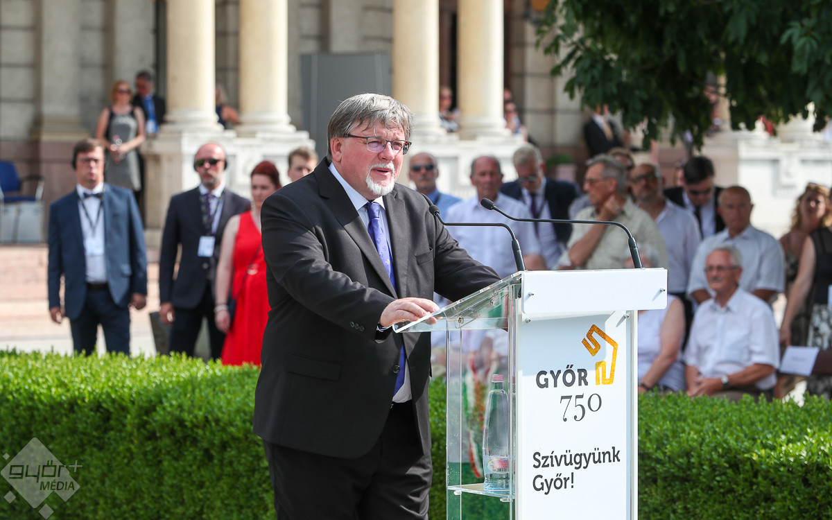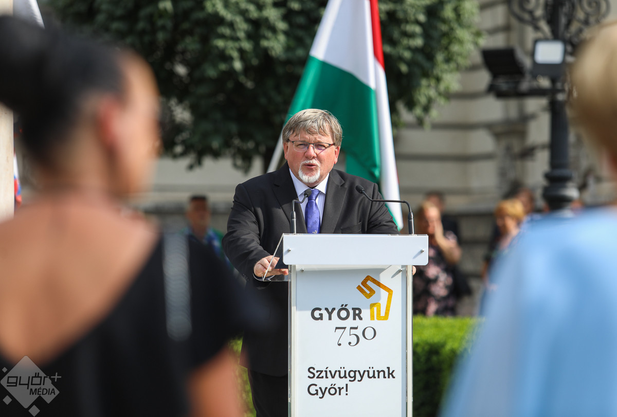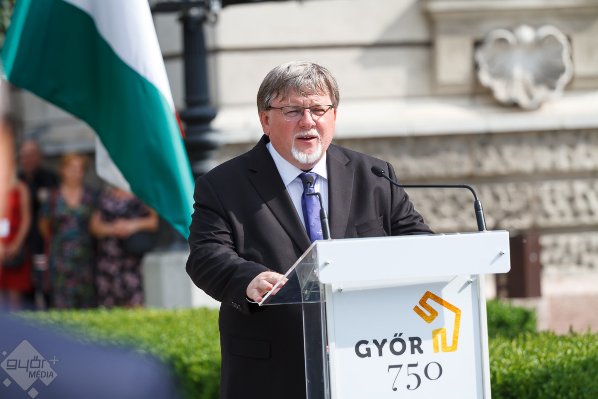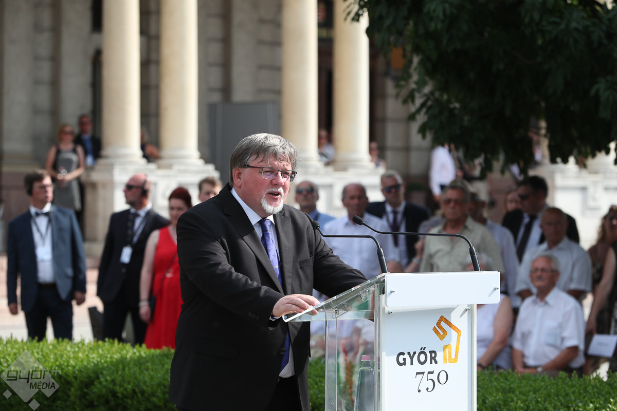 Ezt követően azt fejtette ki, hogy háromnegyed év milyen hosszú idő a történelemben: 750 évvel ezelőtt nem volt még reneszánsz, de Győr város lett. – hangoztatta. – Nem létezett még az Amerikai Egyesült Államok, de Győr már város lett. A trónon Árpádházi király ült, amikor Győr város lett. Ilyen dimenzióban gondolkodva kiderül, hogy a győriek micsoda örökség birtokában vannak.