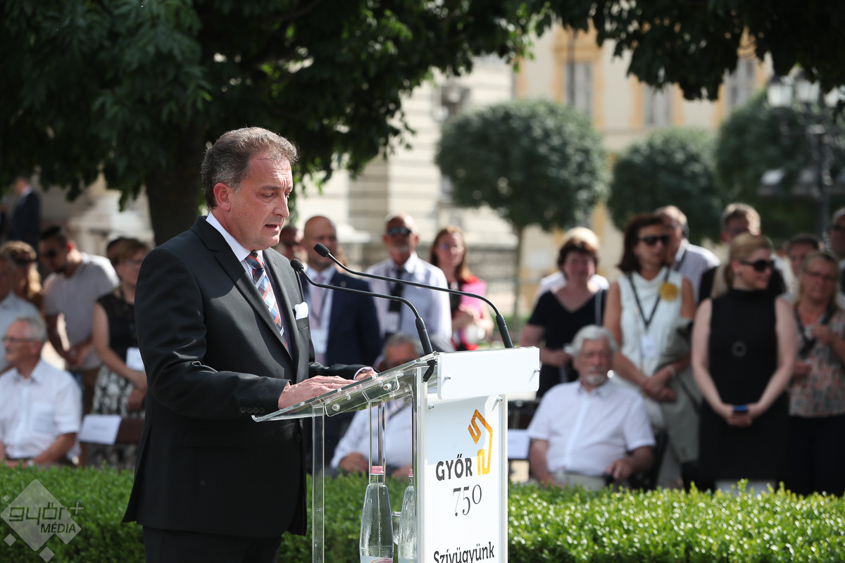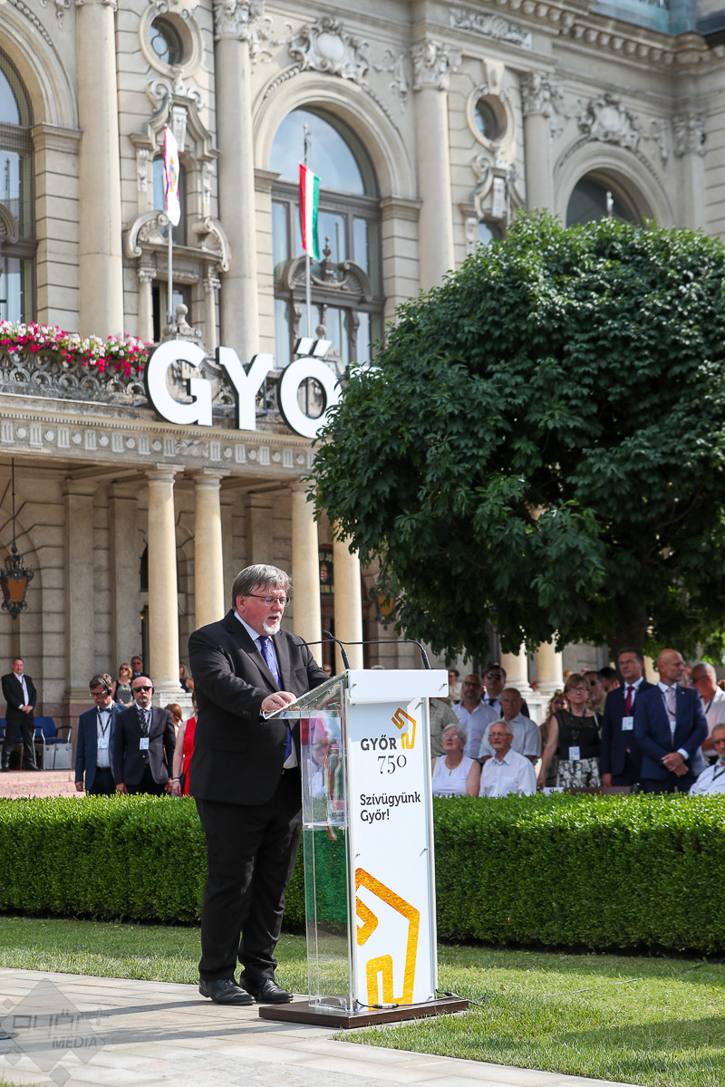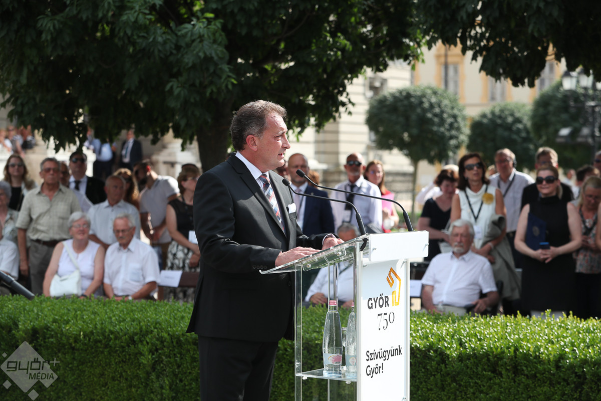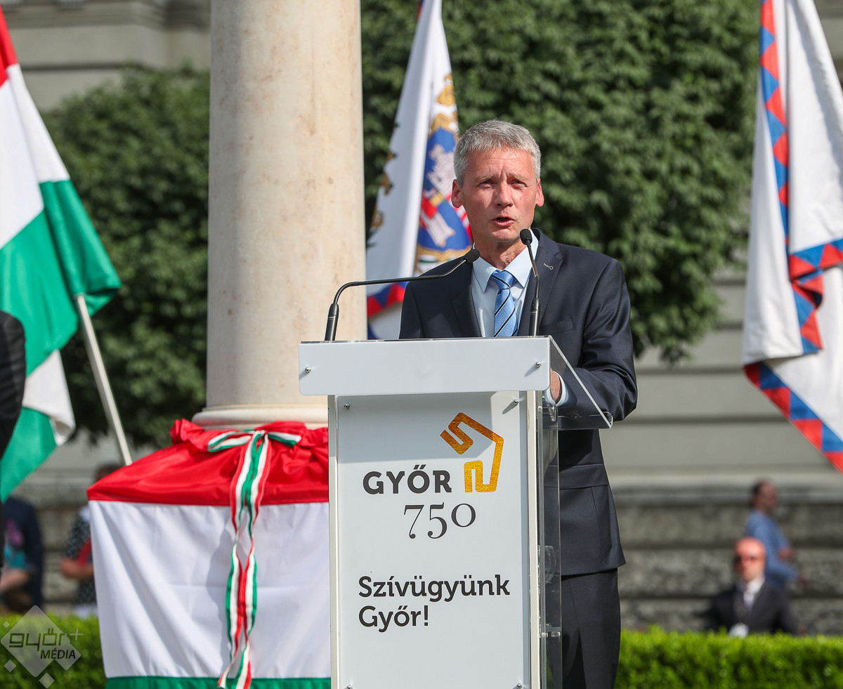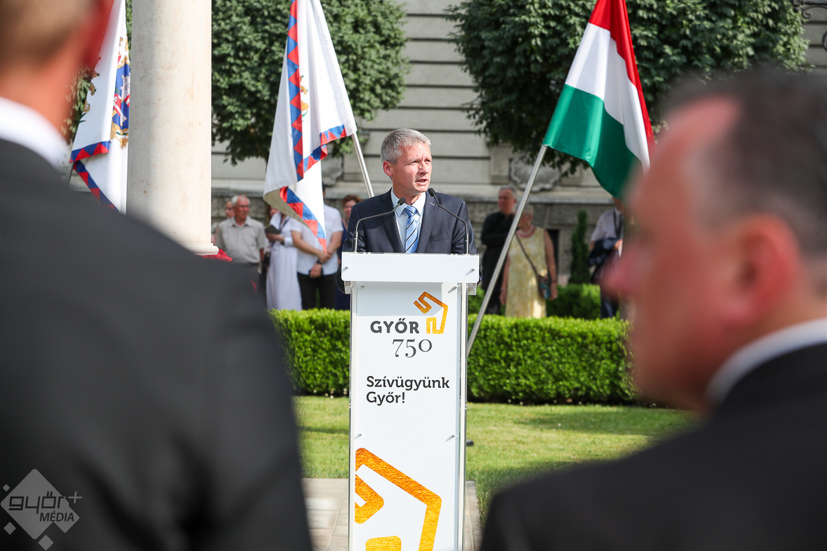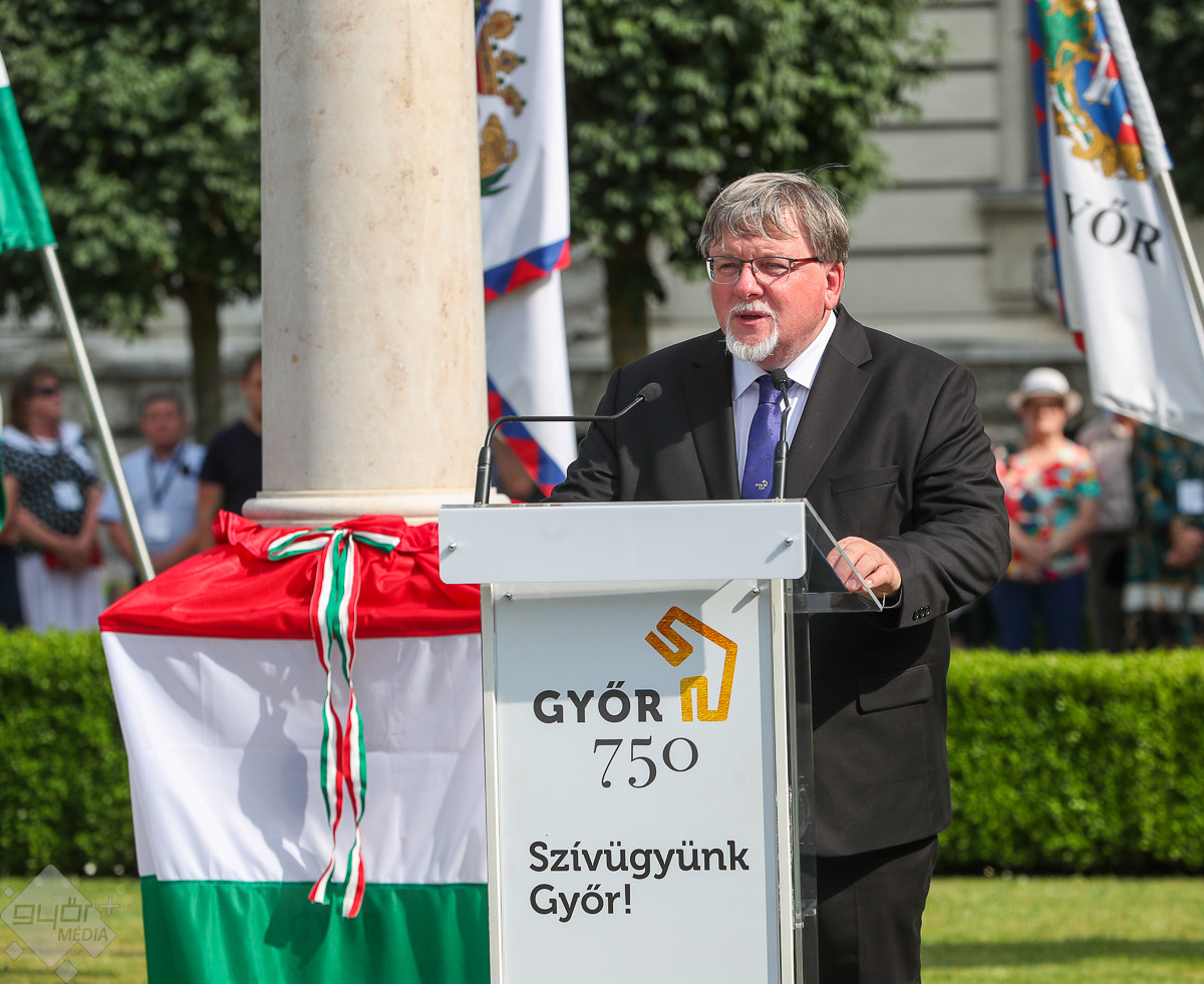 Ezt követően azt fejtette ki, hogy háromnegyed év milyen hosszú idő a történelemben: 750 évvel ezelőtt nem volt még reneszánsz, de Győr város lett. – hangoztatta. – Nem létezett még az Amerikai Egyesült Államok, de Győr már város lett. A trónon Árpádházi király ült, amikor Győr város lett. Ilyen dimenzióban gondolkodva kiderül, hogy a győriek micsoda örökség birtokában vannak.
