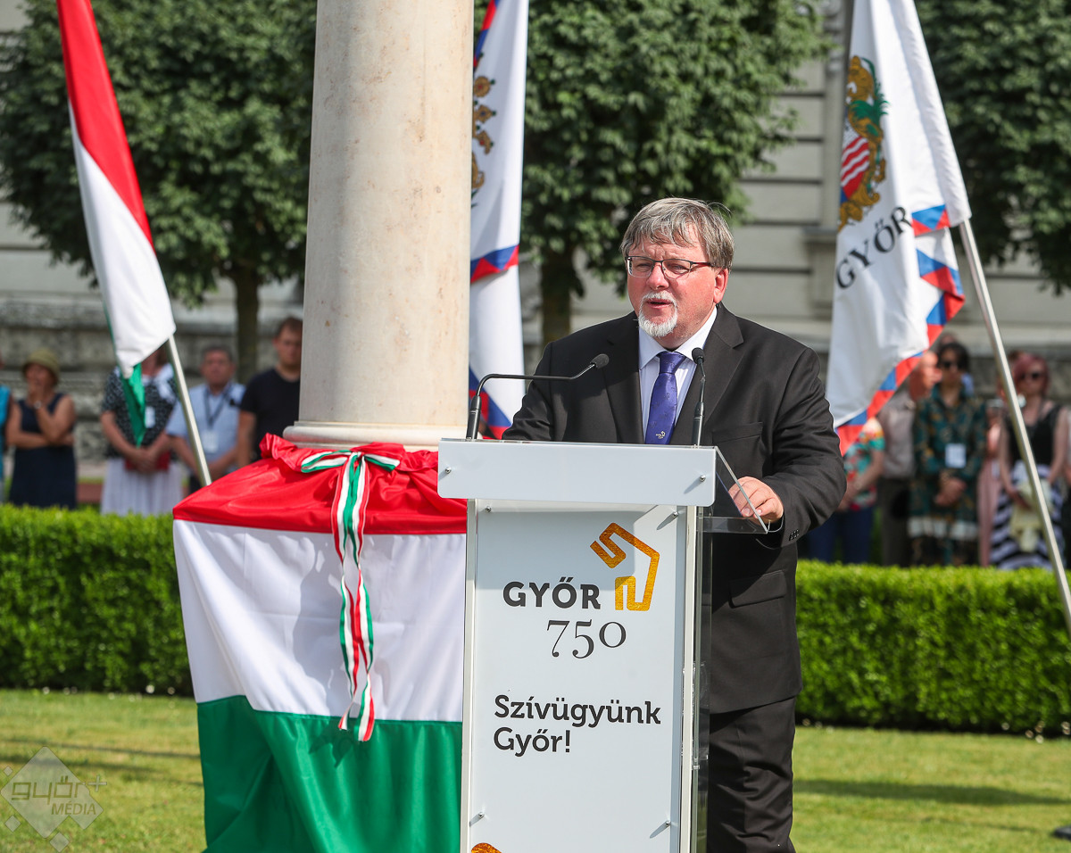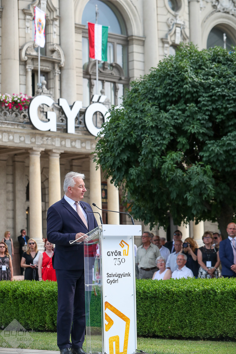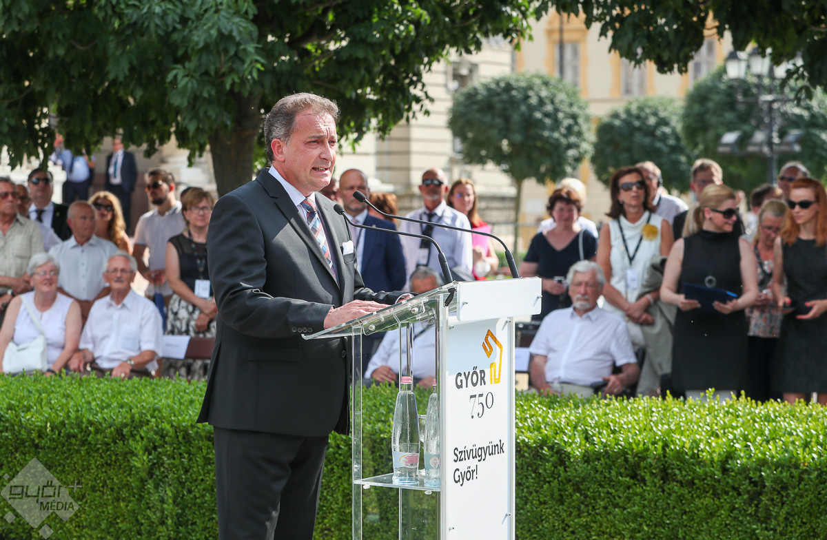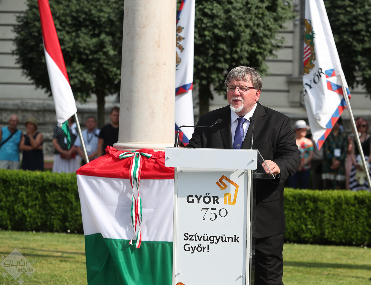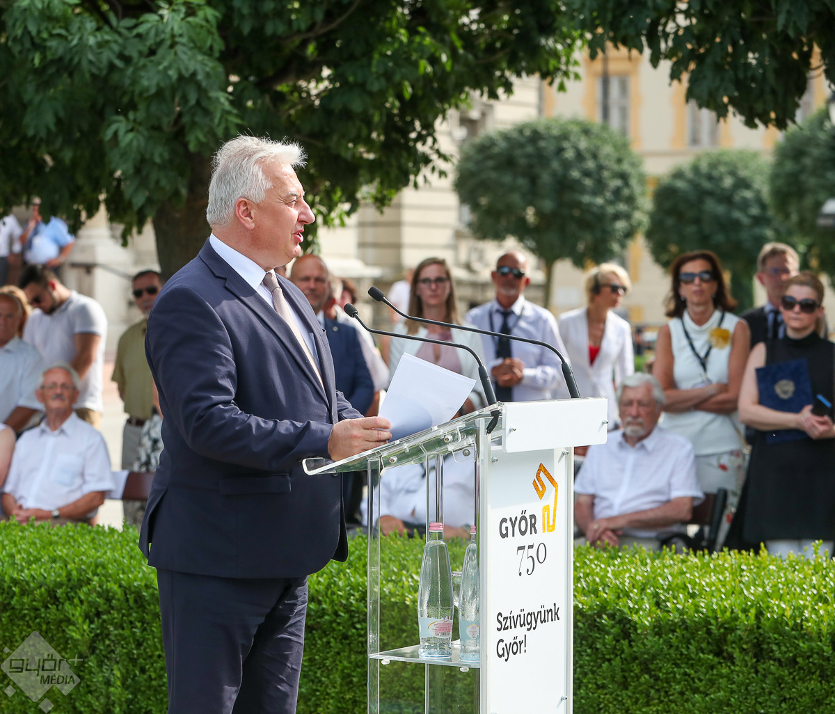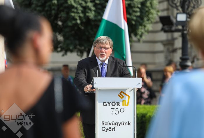 Ezt követően azt fejtette ki, hogy háromnegyed év milyen hosszú idő a történelemben: 750 évvel ezelőtt nem volt még reneszánsz, de Győr város lett. – hangoztatta. – Nem létezett még az Amerikai Egyesült Államok, de Győr már város lett. A trónon Árpádházi király ült, amikor Győr város lett. Ilyen dimenzióban gondolkodva kiderül, hogy a győriek micsoda örökség birtokában vannak.