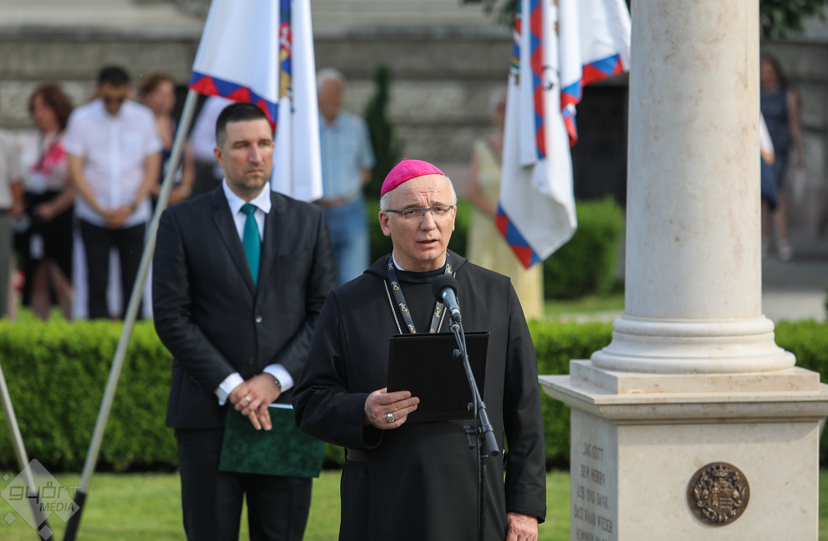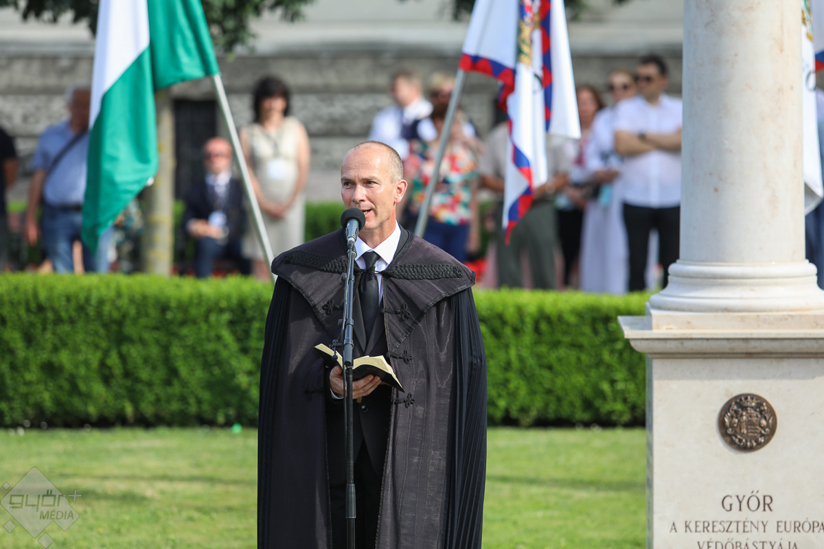 hazaszeretet, hűség, helytállás és hősiesség. „Fellapozta” a város történetét, mindegyik tulajdonságra történelmi példákat, eseményeket, történéseket hozott. Külön foglalkozott a török megszállással, és a győri vár visszafoglalásának európai jelentőségével. Emlékeztetett arra, hogy Rudolf császár még a hírvivőt is megjutalmazta, s ez is igazolja, mekkora megnyugvást okozott a győriek helytállása Európában.