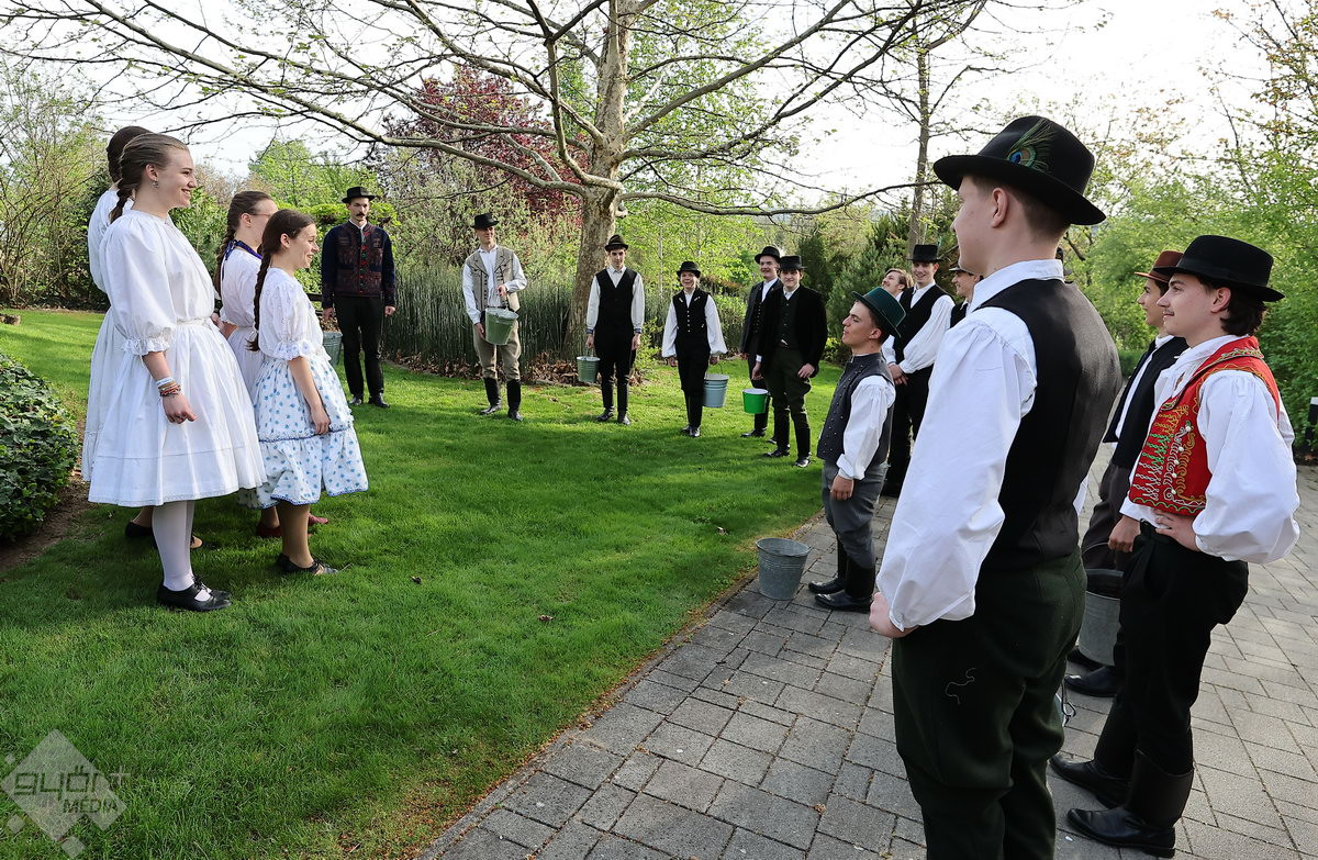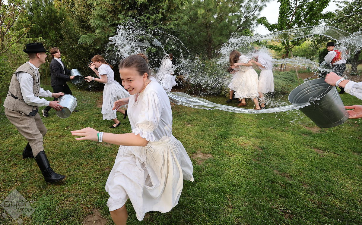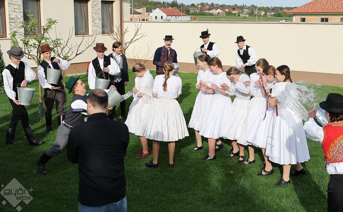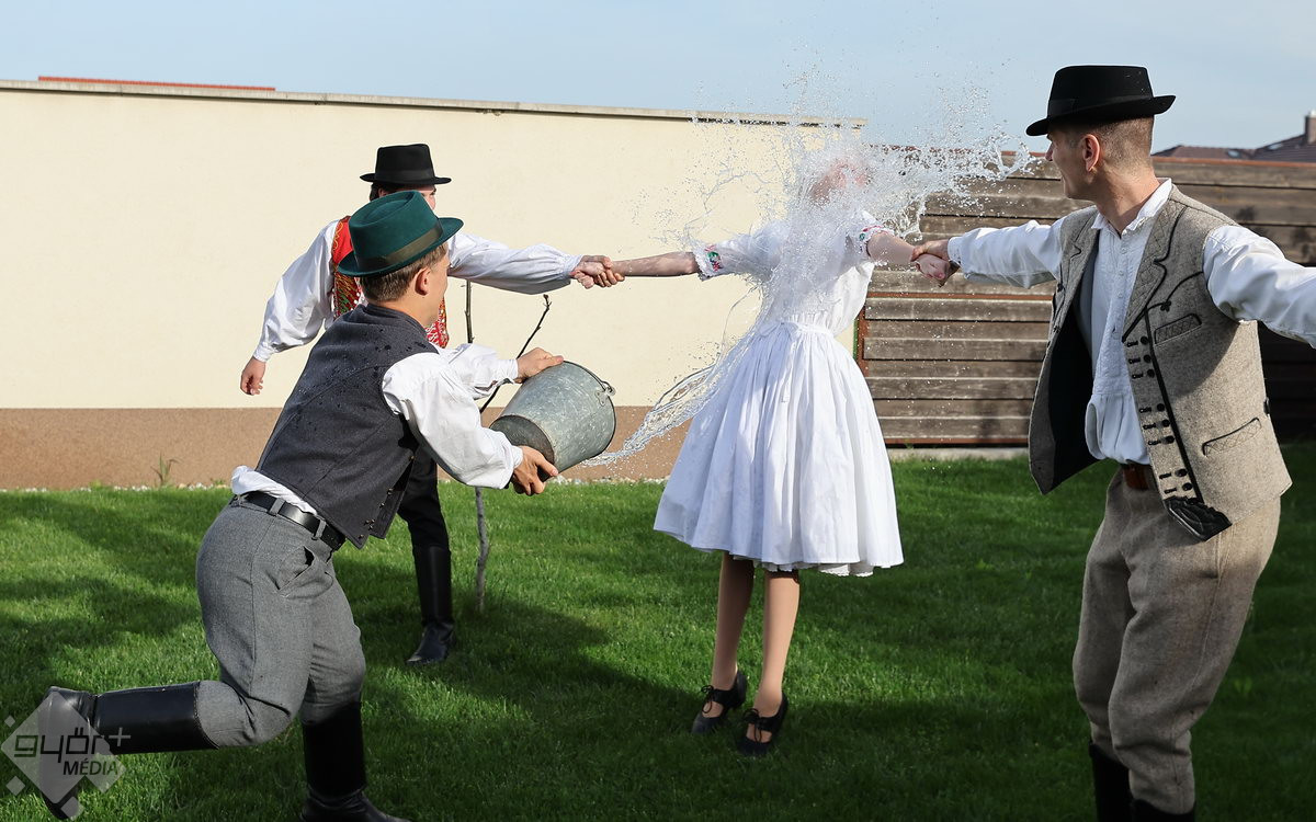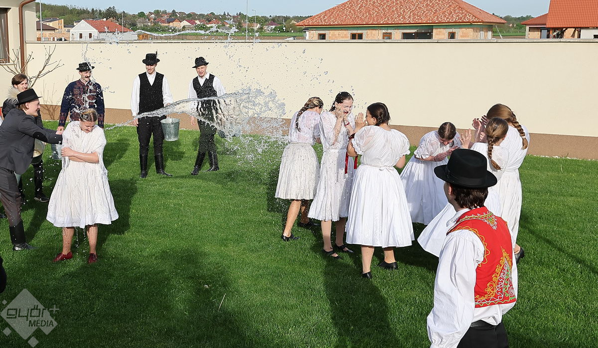 Nem úgy, mint a Csobolyó Néptáncegyüttesnél: az 1991-ben alapított egyesületnél a mai napig hűen őrzik a hagyományt. Hideg vízzel töltött vödrökkel felszerelkezve indultak a legények a lányos házhoz, ahol kérdeztek ugyan – „Szabad-e locsolni” – de a válasz már nem volt annyira érdekes: aki a közelben volt, bizony kapott az áldásból. Ahogyan azok is, akik a néptáncosok győrújbaráti „főhadiszállásánál” várakoztak.