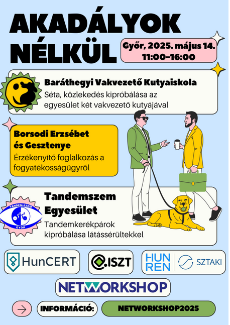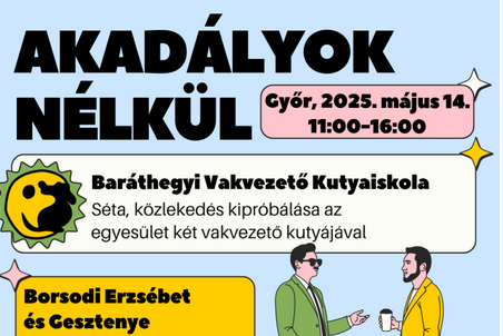 Az „Akadályok nélkül” keretében május 14-én 11:00-16:00 óra között a Baráthegyi Vakvezető Kutyaiskola jóvoltából ki lehet próbálni, milyen vakvezető kutyák támogatásával közlekedni; részt vehetnek a Széchenyi István Egyetemen végzett Borsodi Erzsébet fogyatékosságügyi tanácsadó érzékenyítő foglalkozásán, ahová vakvezető kutyája, Gesztenye is elkíséri. A Tandemszem Egyesület hozzájárulásával lehetőség nyílik sportolásra is, a résztvevők tandembicikliket próbálhatnak ki látássérült társakkal.