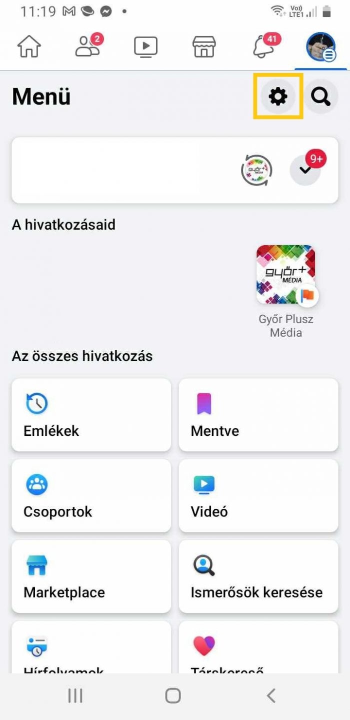 Lépjen be telefonjáról a Facebook fiókja menüjébe, majd az első fotón sárgával jelölt „Beállítások” ikonra kattintson!