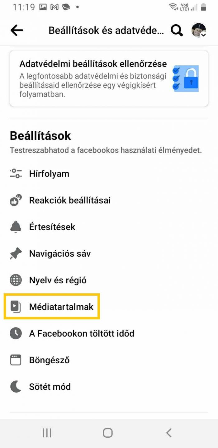 A következő lépésben görgessen lejjebb, és keresse meg a második képen sárga kerettel jelölt „Médiatartalmak” feliratot majd kattintson rá!