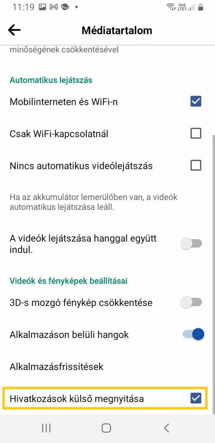 Ezt követően görgessen le egészen a harmadik képen sárgával jelölt „Hivatkozások külső megnyitása” feliratig, és az üres négyzetet pipálja ki, hogy úgy nézzen ki, mint a mellékelt fotón.