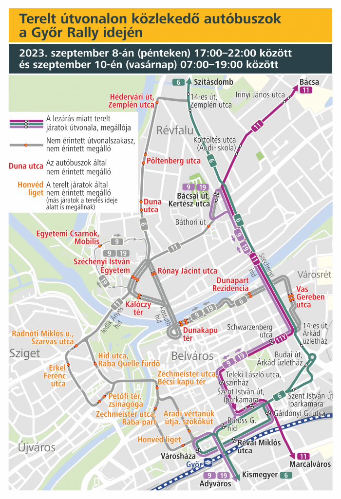 2023. szeptember 8-án (pénteken) 17:00–22:00 között és szeptember 10-én (vasárnap) 07:00–19:00 között, a Győr Rally megrendezése miatt lezárják a Széchenyi István Egyetem környéki utcákat és a Móricz Zsigmond rakpartot, ezért az érintett járatok terelt útvonalon közlekednek.