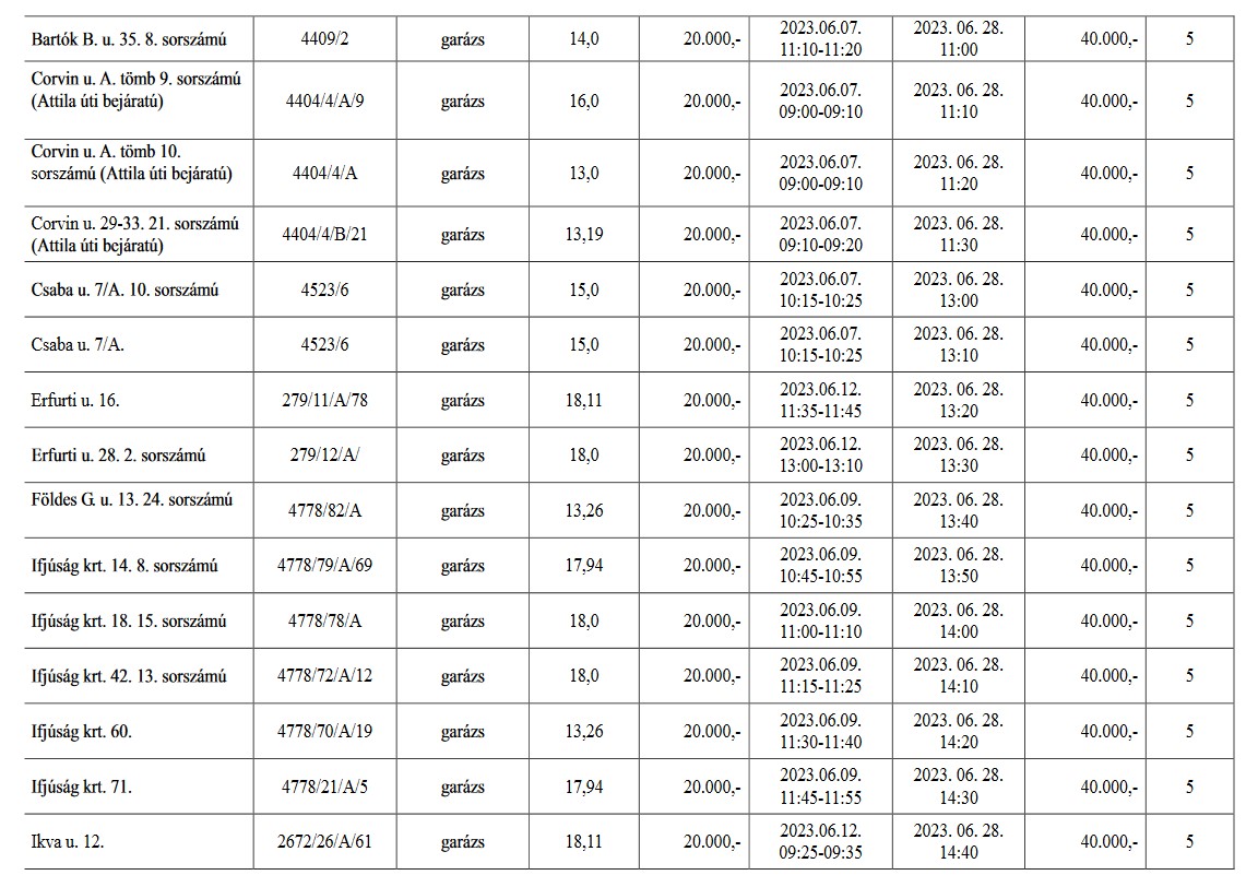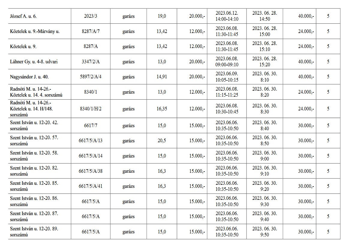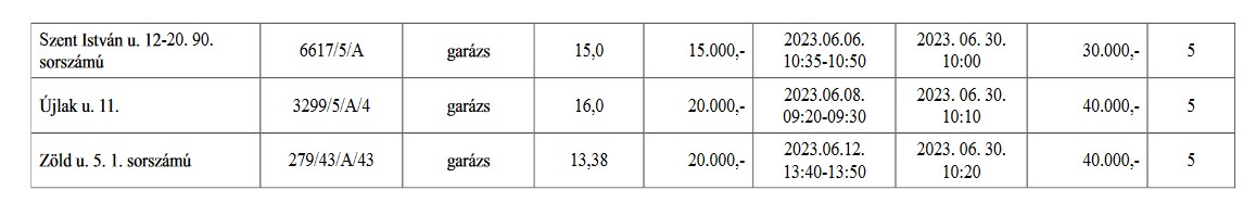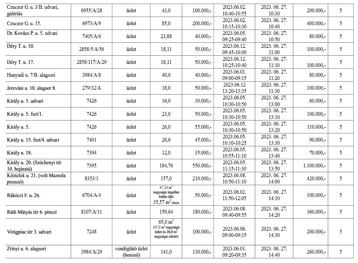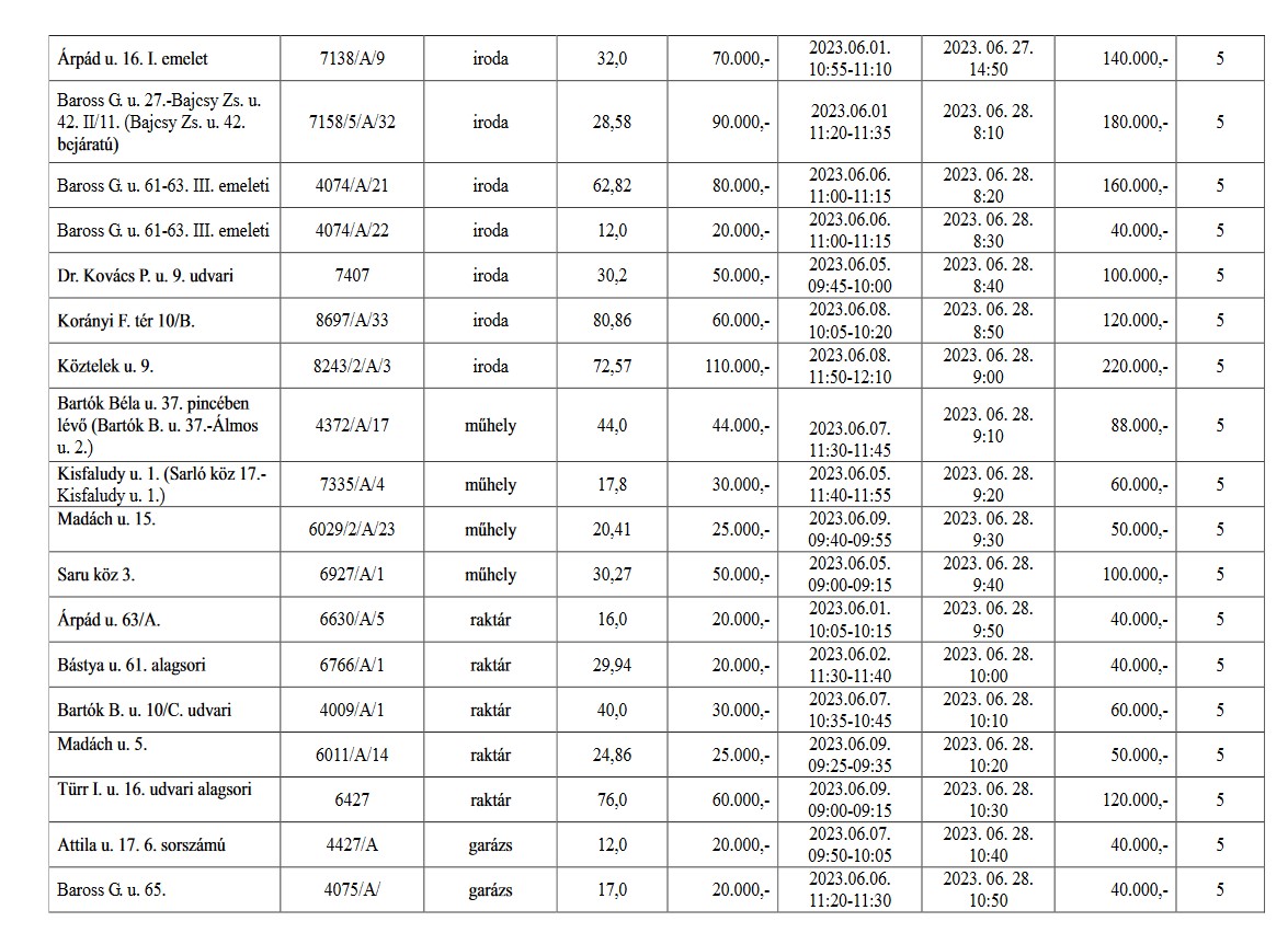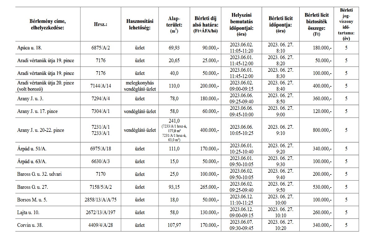A részletes hirdetmények a Győr-Szol Zrt. központjában, valamint a www.gyor.hu honlapon Városháza/Vagyonhasznosítási felhívás/Helyiség bérbeadás menüpont alatt tekinthetők meg 2023. május 23. napjától 2023. június 23. napjáig.