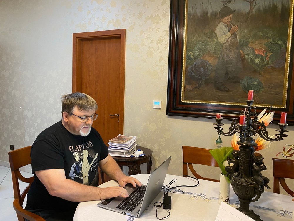 Otthonról, Skype-on irányítja a várost, úgy tudom, ma is volt egy videókonferenciájuk.