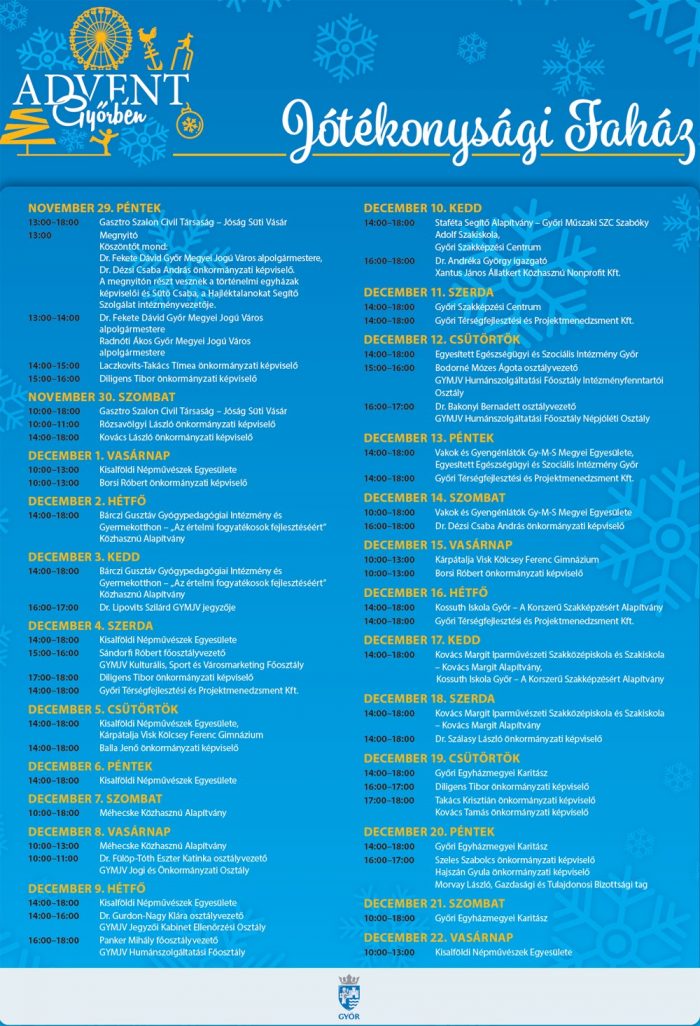 A faház megnyitása alkalmával dr. Fekete Dávid alpolgármester elmondta, már hagyomány a városban, hogy Advent idején a városi intézményekkel, civil és egyházi szervezetekkel közösen jótékonykodásra hívjuk a győrieket. Az ünnepre készülődve a Széchenyi téri faháznál megállhatunk beszélgetni, vásárolni, és közben másokon segíteni. Hozzátette, a téli időszakban a fedél nélkül élőkre is fokozottan figyelnünk kell. Az önkormányzat százezer forintos adományát az alpolgármester és Dr. Dézsi Csaba András önkormányzati képviselő adta át a Hajléktalanokat Segítő Szolgálat részére.