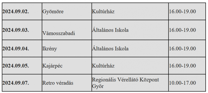 A megadott programon kívül az alábbi nyitva tartásban várjuk a Regionális Vérellátó Központban a vért adni szándékozókat (Győr, Magyar u. 8.):