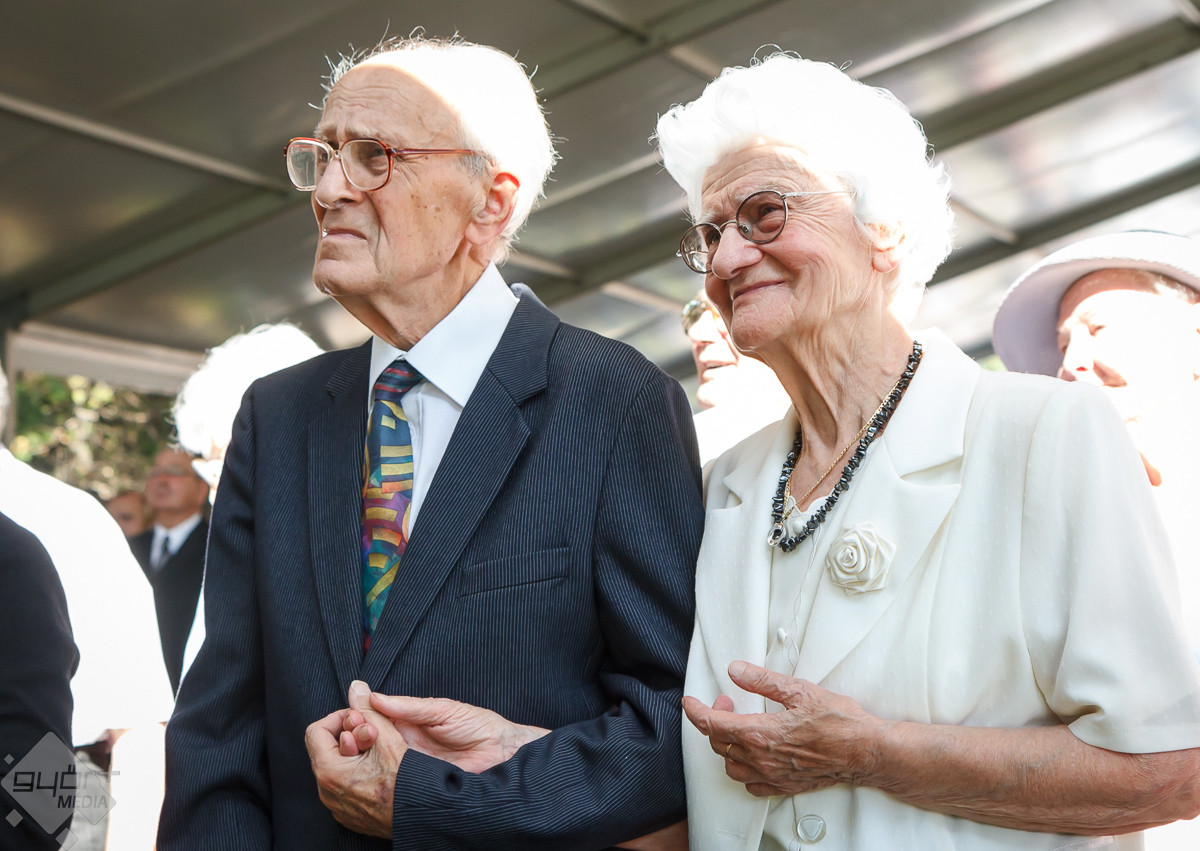 Két idős házaspár hatvanöt együtt töltött évért mondott köszönetet az Úristennek és egymásnak szeptember 5-én a győri Püspökvár kertjében, ahol a Győri Egyházmegye számos jubiláns házaspárját köszöntötték szentségi házasságkötésük kerek évfordulója alkalmából.