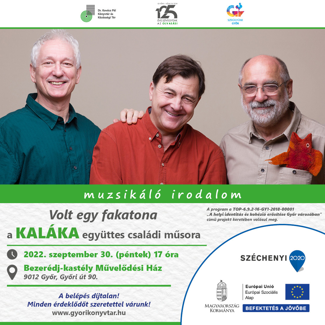 2022. szeptember 30-án (pénteken) 17 órakor a Dr. Kovács Pál Könyvtár és Közösségi Tér Központi Könyvtára Bezerédj-kastély Művelődési Házában (Győr, Győri út 90.) a Kaláka együttes ’’Volt egy fakatona’’ című családi műsorát nézhetik meg.