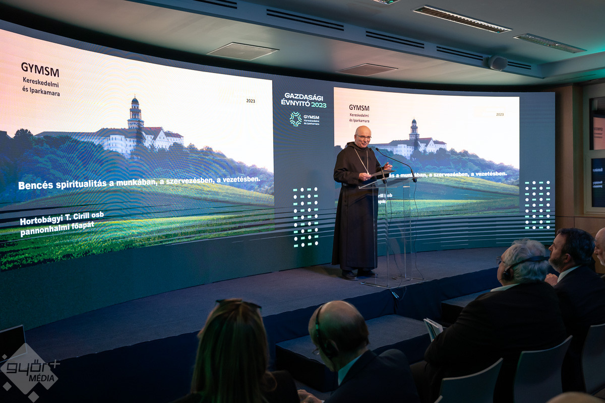 Hortobágyi T. Cirill pannonhalmi főapát előadásában hangsúlyozta a lelkierő fontosságát. Kiemelte, a tanulás és a személyes fejlődés, valamint a bátorság elengedhetetlen a sikerhez. Az apátok vezetési stílusáról is beszélt.