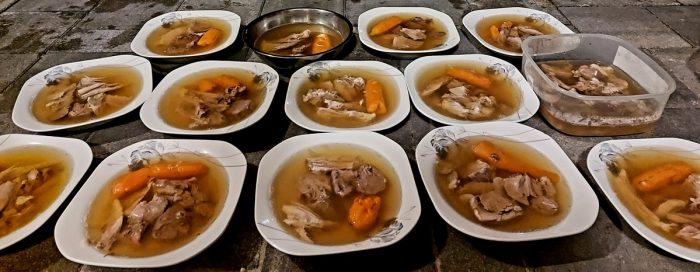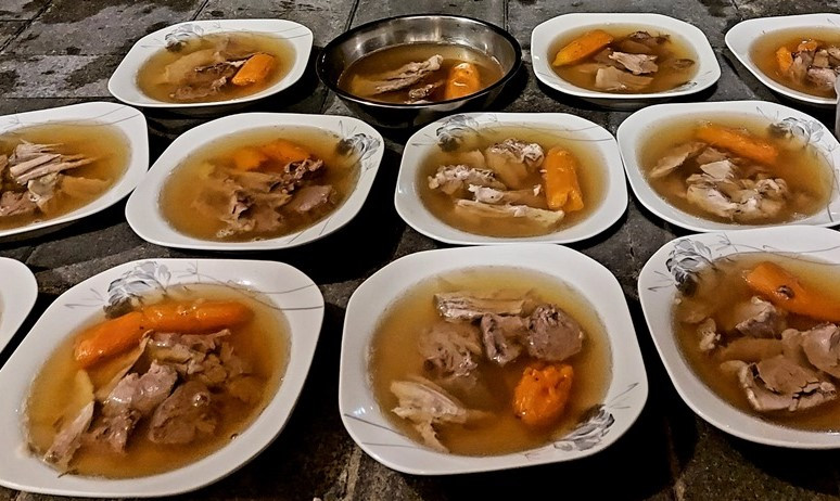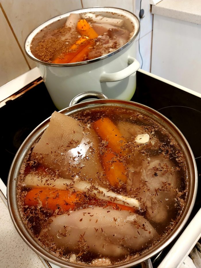 A húsokat, a bőrt, a körmöt jól megmosom, megtisztítom, majd egyszer felforralom és azt a vizet leöntöm róla. Újra felöntöm hideg vízzel, hozzáadom a többi hozzávalót, megfűszerezem, majd nagyon lassú tűzön, nem forralva főzöm. A tetejéről a habot, a zsírt rendszeresen lemerem. Ha minden hozzávaló megfőtt benne, leszűröm és jöhet a családi koreográfia.