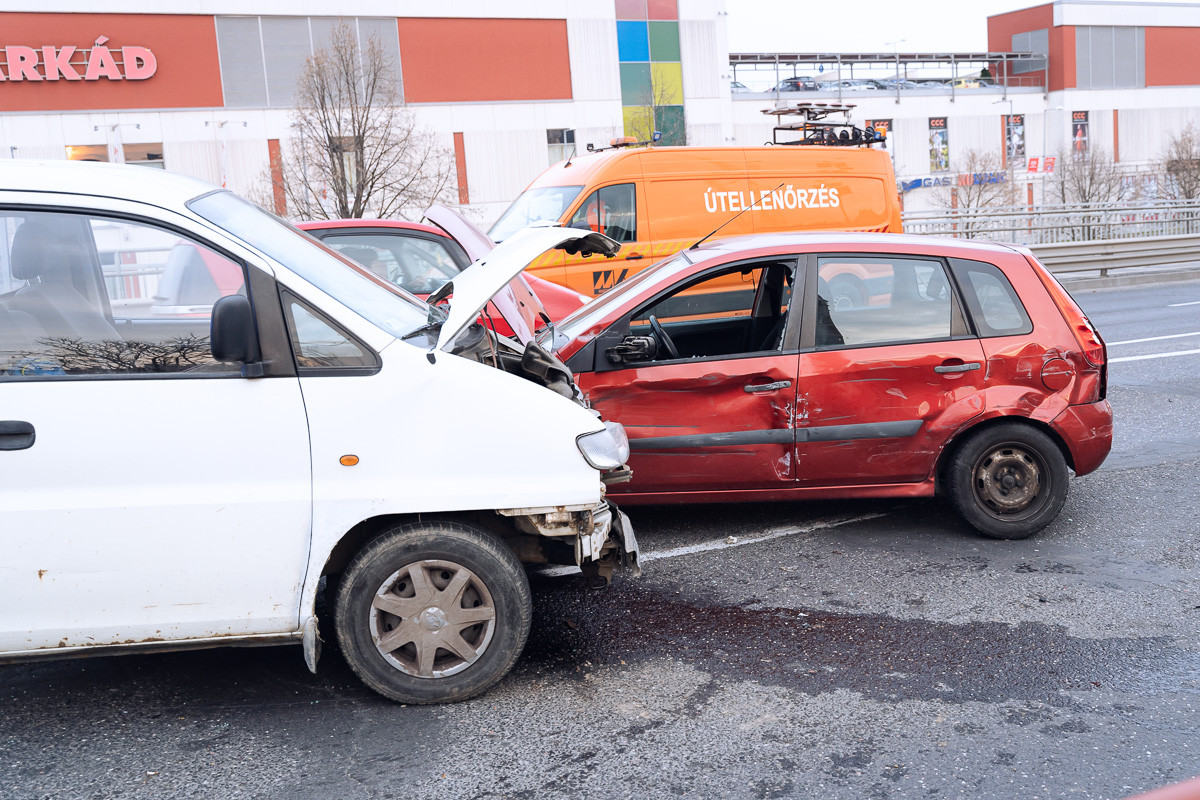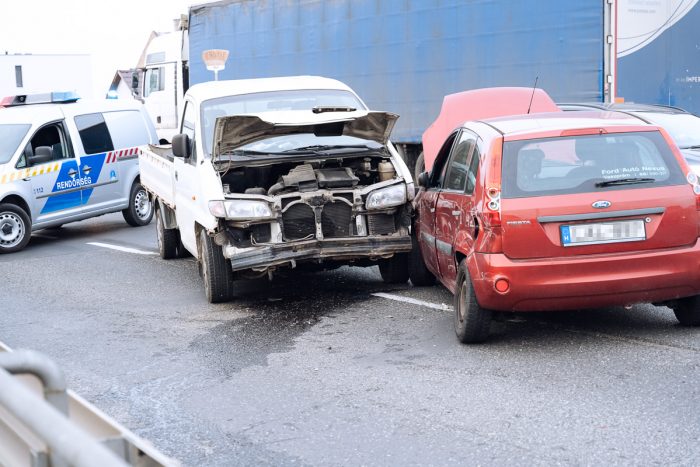 Összeütközött négy személyautó, egy kisteherautó és egy nyerges vontató Győrben, a Nagymegyeri úton.