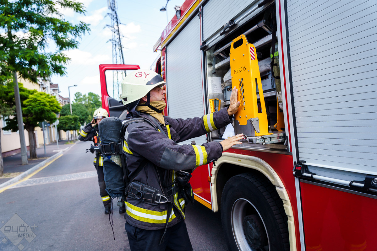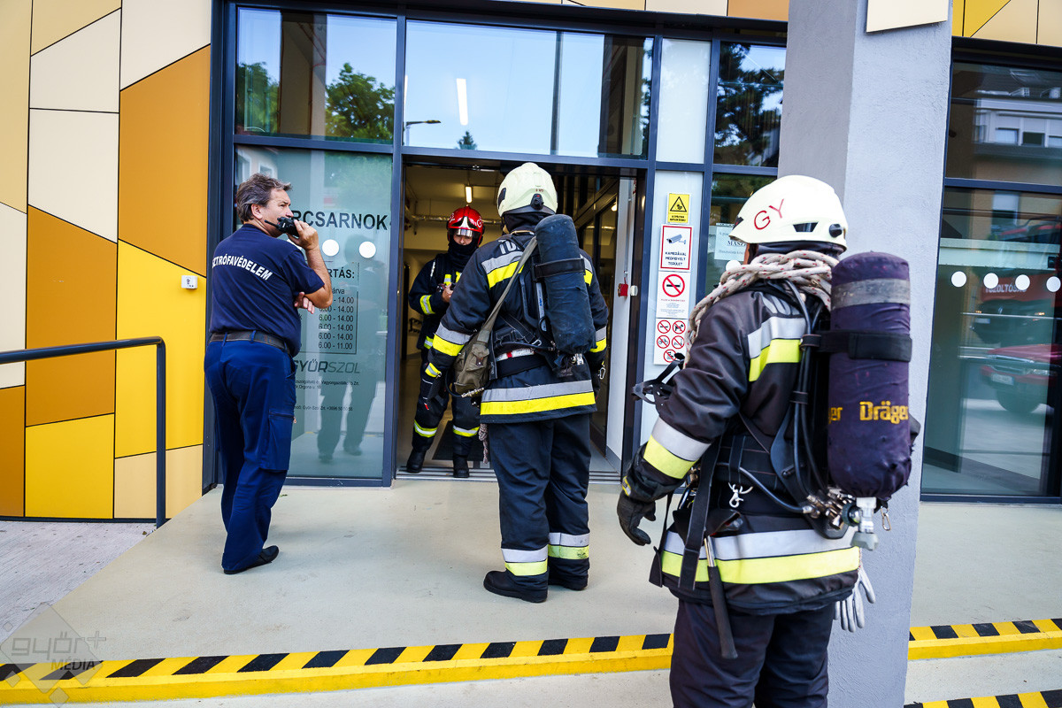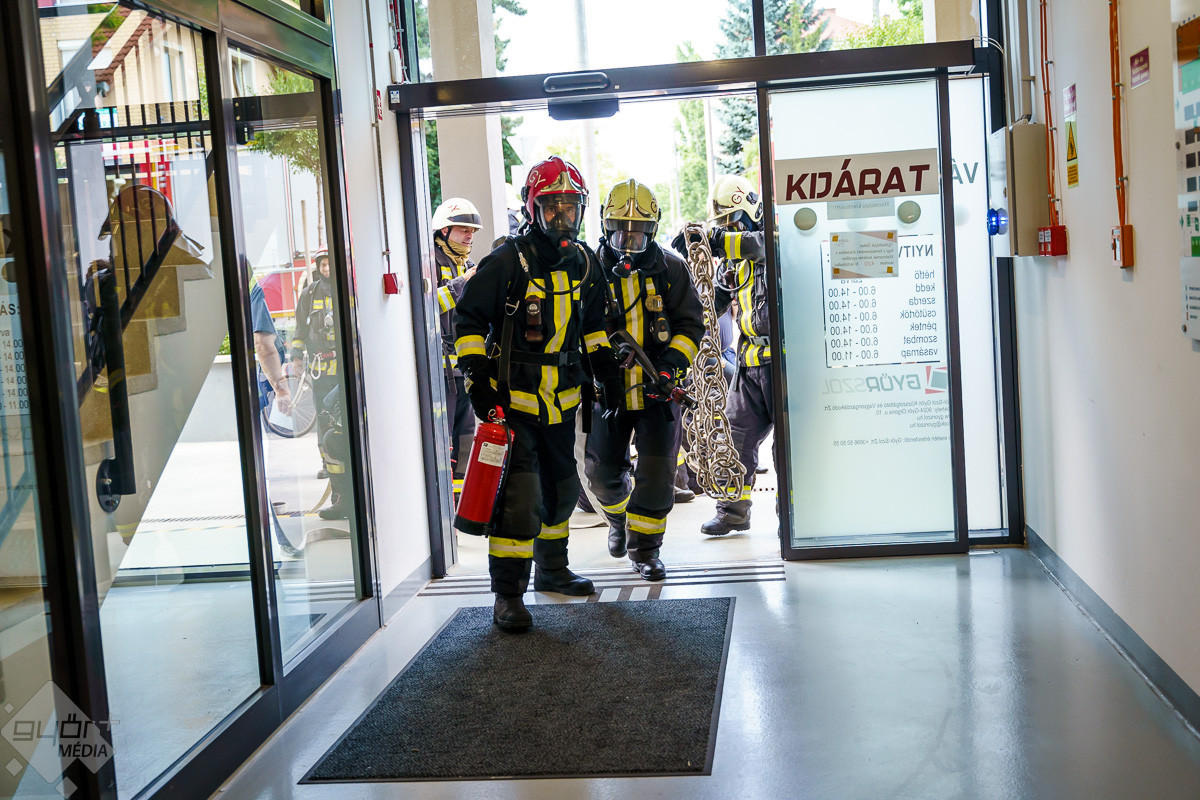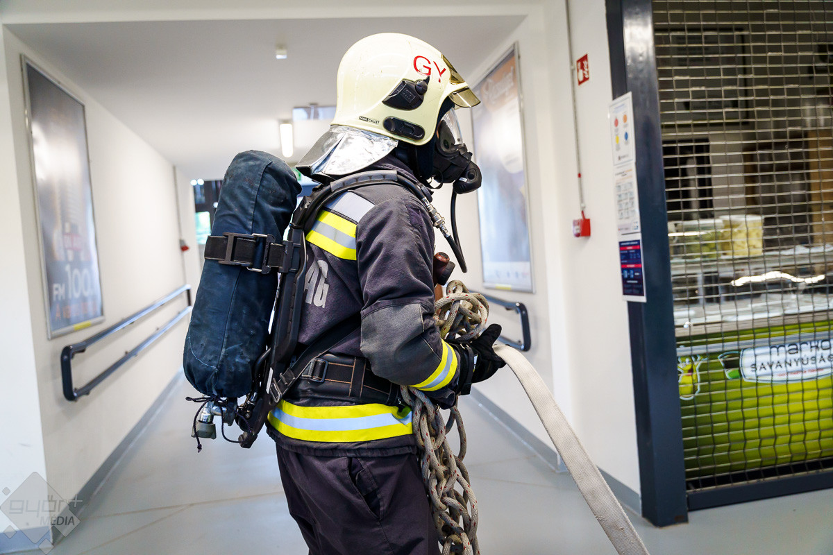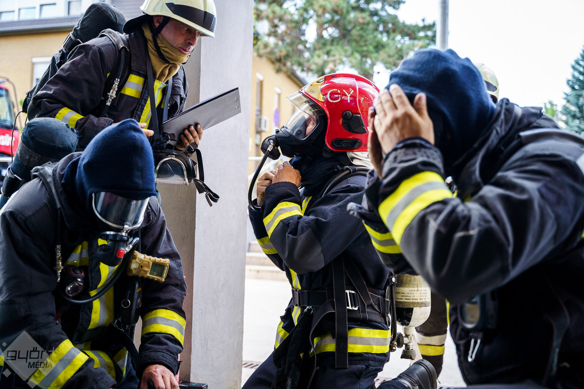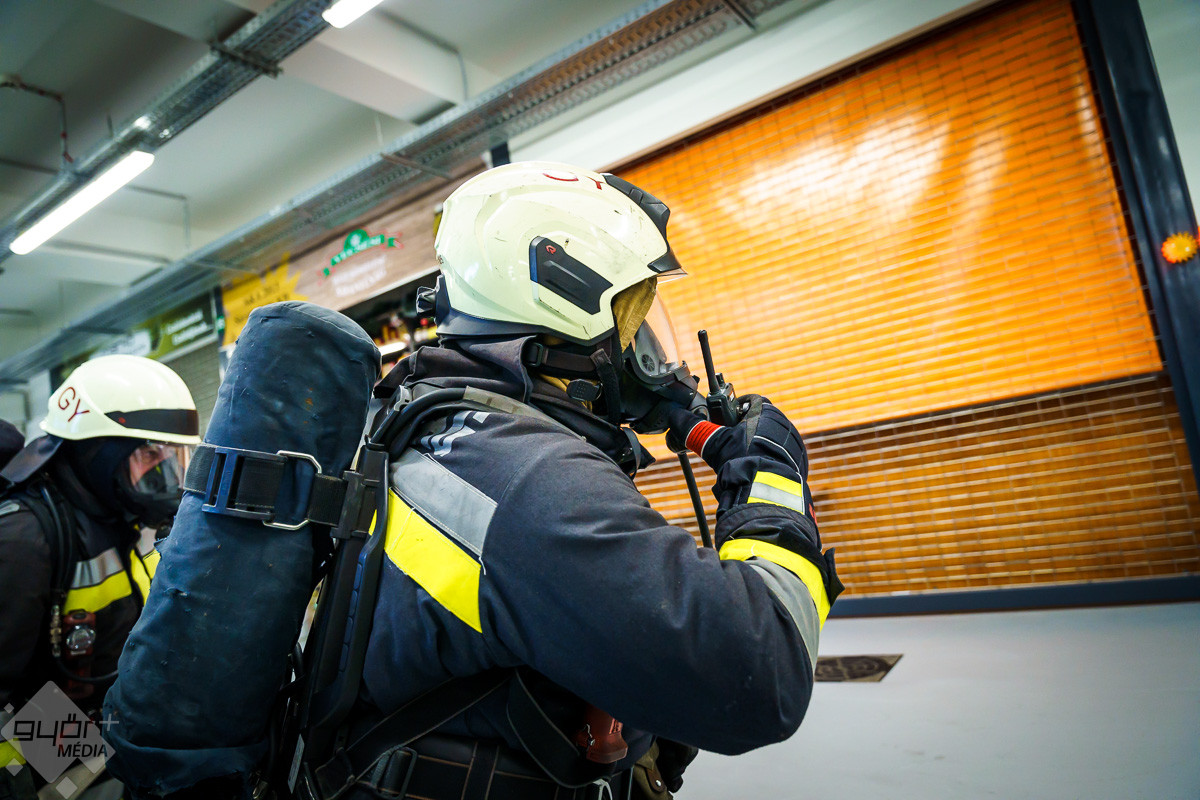 A mostani gyakorlaton az életmentést, a légzőkészülékben történő feladat végrehajtást, a sugár és táplálásszerelést, az EDR rádión történő szabályos kommunikációt, valamint a tűzoltásvezetői feladatok megvalósulását is gyakorolták a vásárcsarnok területén egy feltételezett káreseménynél a győri és a pannonhalmi hivatásos tűzoltók.