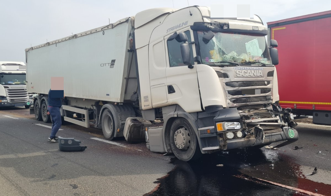 Baleset történt kora délután az M1-es autópálya 115-ös kilométerszelvényében, Győr térségében. Két tehergépkocsi ütközött össze.