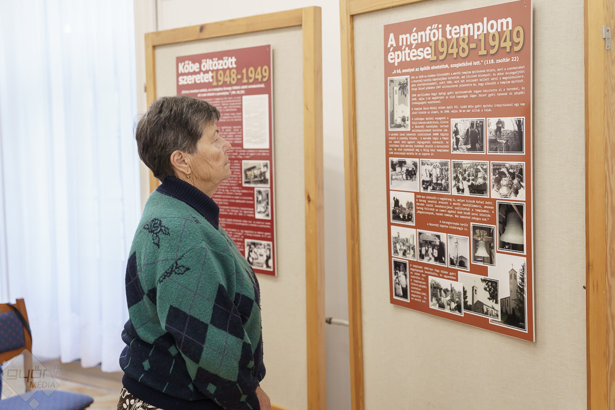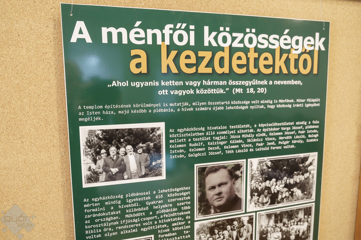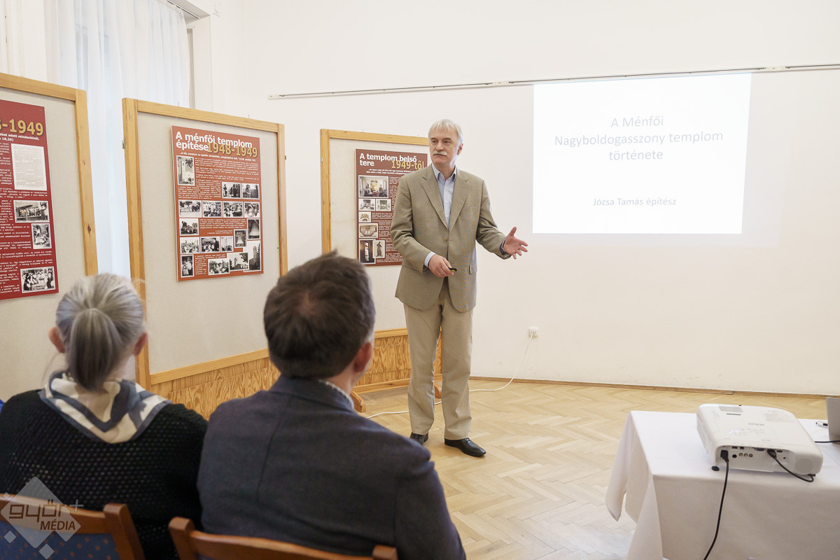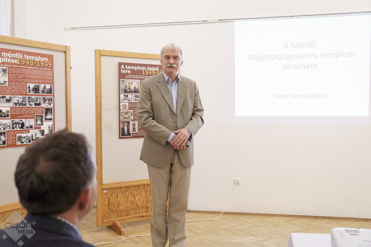 „Templomot akarunk! – ez volt a jelmondata a ménfőieknek, akik az első szóra odaálltak az ügy mellé. Jöttek kapával, ásóval. A férfiak ástak, az asszonyok hozták az ebédet. Mindenki mindenben segédkezett. Az iskolában ekkor már nem lehetett hittant tanítani, de ők is próbáltak támogatókat szerezni. A templom társadalmi munkában épült. Volt egy építésvezető, aki tudta, mit, hogyan kell csinálni, és mindig, mindenhez volt segítség. Az emberek hozták a szerszámokat, a gépeket és a saját fizikai erejüket sem sajnálták. Anyagot hordtak, téglát raktak, vagy ami éppen adódott. Örömmel csinálták, és ezt az örömöt átörökítették a most élő, templomba járó utódjaikra. Ők is fontosnak tartják a rendben tartását, a szépítgetését, s ők is megtöltik élettel. A templom azóta folyamatosan épül, szépül. A mai kiállításon bemutatott régi képeken biztosan sokan felismerik a szüleiket, nagyszüleiket, rokonaikat, akik részt vettek a templom építésében, életében.” – mondta Józsa Tamás.