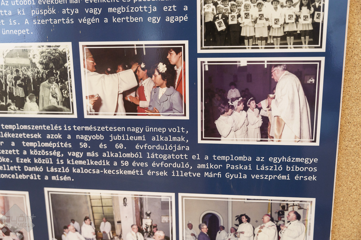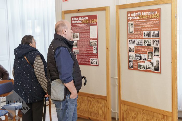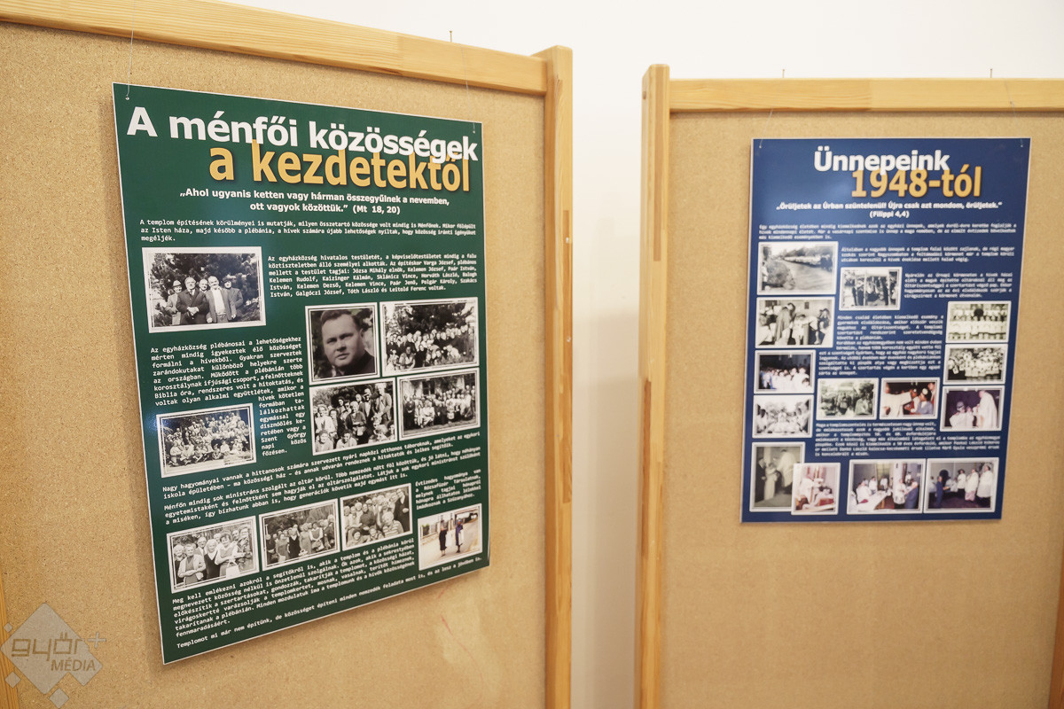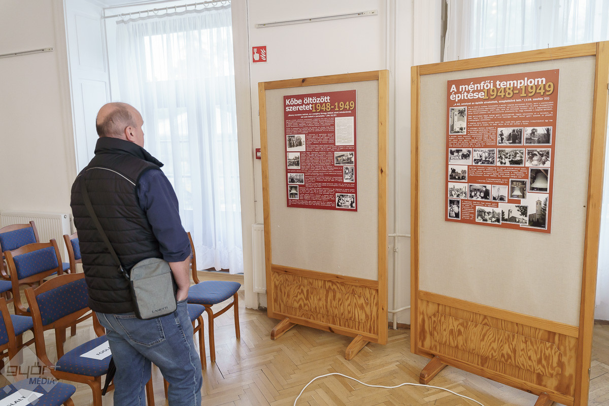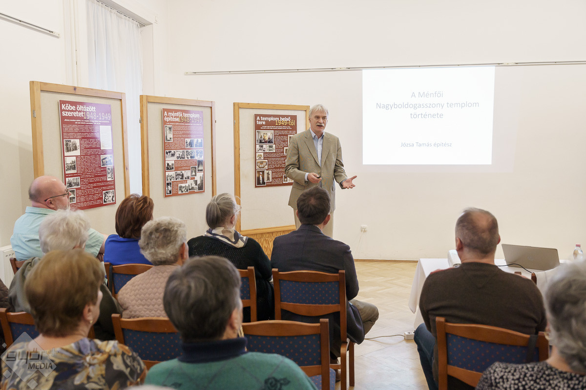 „Templomot akarunk! – ez volt a jelmondata a ménfőieknek, akik az első szóra odaálltak az ügy mellé. Jöttek kapával, ásóval. A férfiak ástak, az asszonyok hozták az ebédet. Mindenki mindenben segédkezett. Az iskolában ekkor már nem lehetett hittant tanítani, de ők is próbáltak támogatókat szerezni. A templom társadalmi munkában épült. Volt egy építésvezető, aki tudta, mit, hogyan kell csinálni, és mindig, mindenhez volt segítség. Az emberek hozták a szerszámokat, a gépeket és a saját fizikai erejüket sem sajnálták. Anyagot hordtak, téglát raktak, vagy ami éppen adódott. Örömmel csinálták, és ezt az örömöt átörökítették a most élő, templomba járó utódjaikra. Ők is fontosnak tartják a rendben tartását, a szépítgetését, s ők is megtöltik élettel. A templom azóta folyamatosan épül, szépül. A mai kiállításon bemutatott régi képeken biztosan sokan felismerik a szüleiket, nagyszüleiket, rokonaikat, akik részt vettek a templom építésében, életében.” – mondta Józsa Tamás.